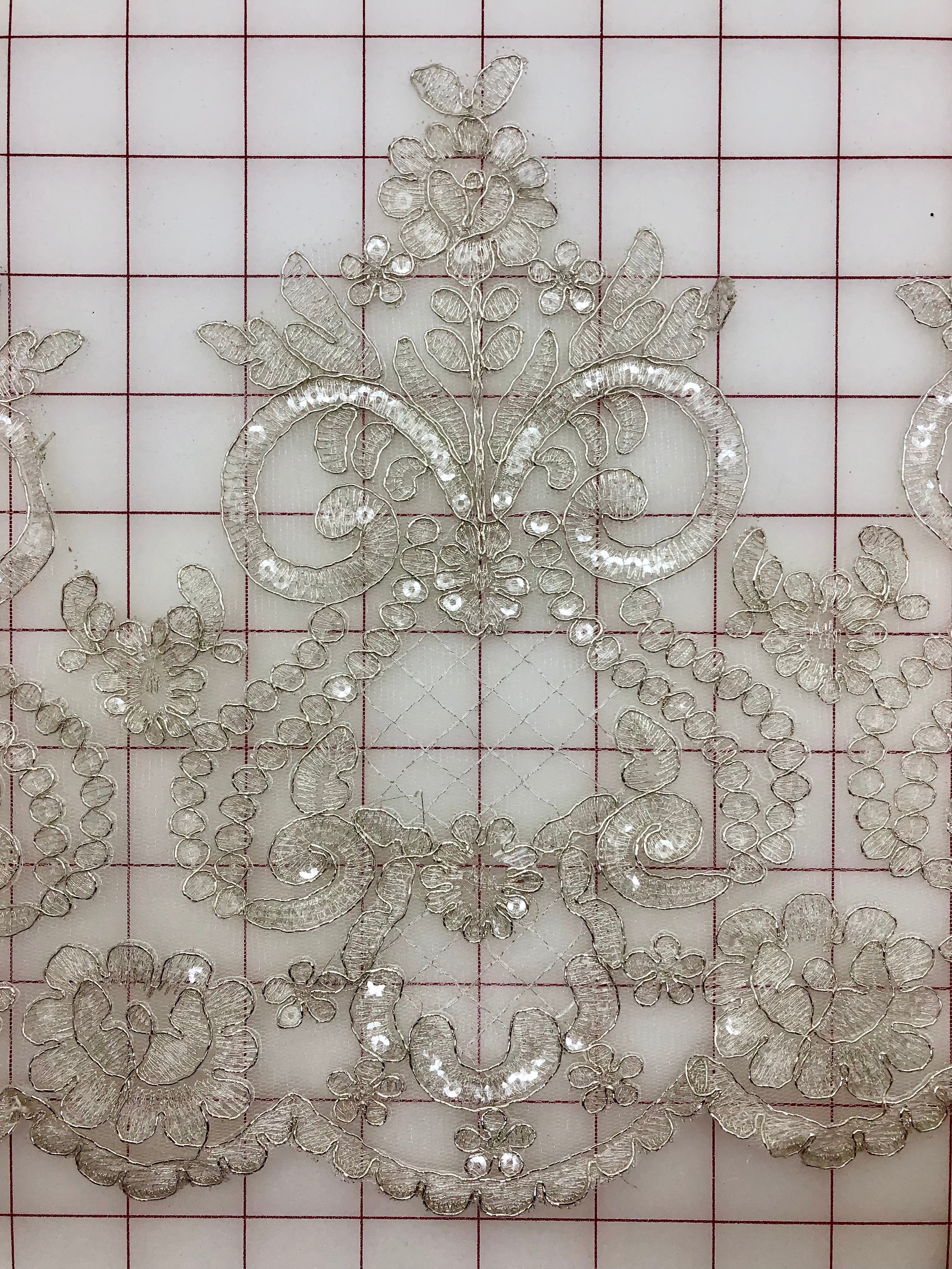 Priced per yard. Beautiful, lightweight, silver metallic sequined lace.