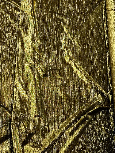 Priced per yard. Gold/Black metallic stretch, 54-inches wide. Smallest length sold online: one-yard.