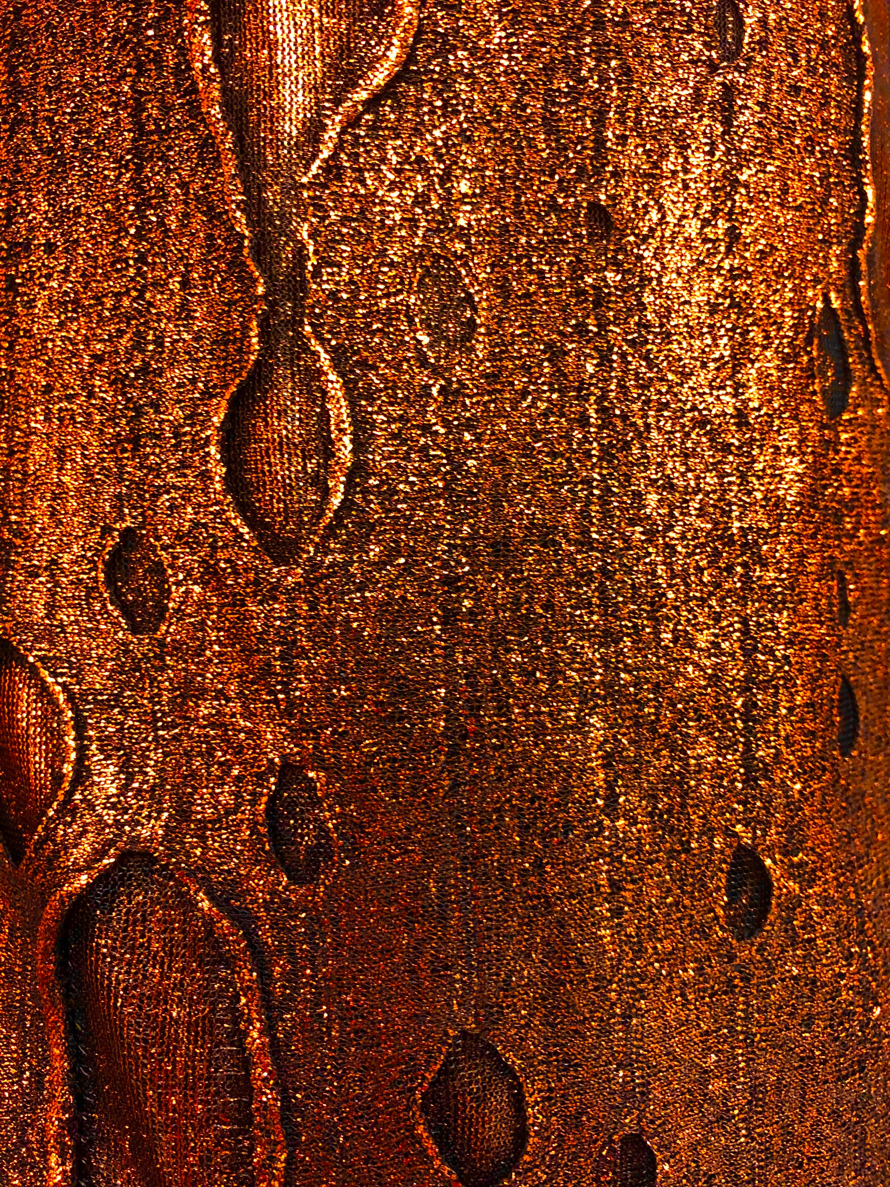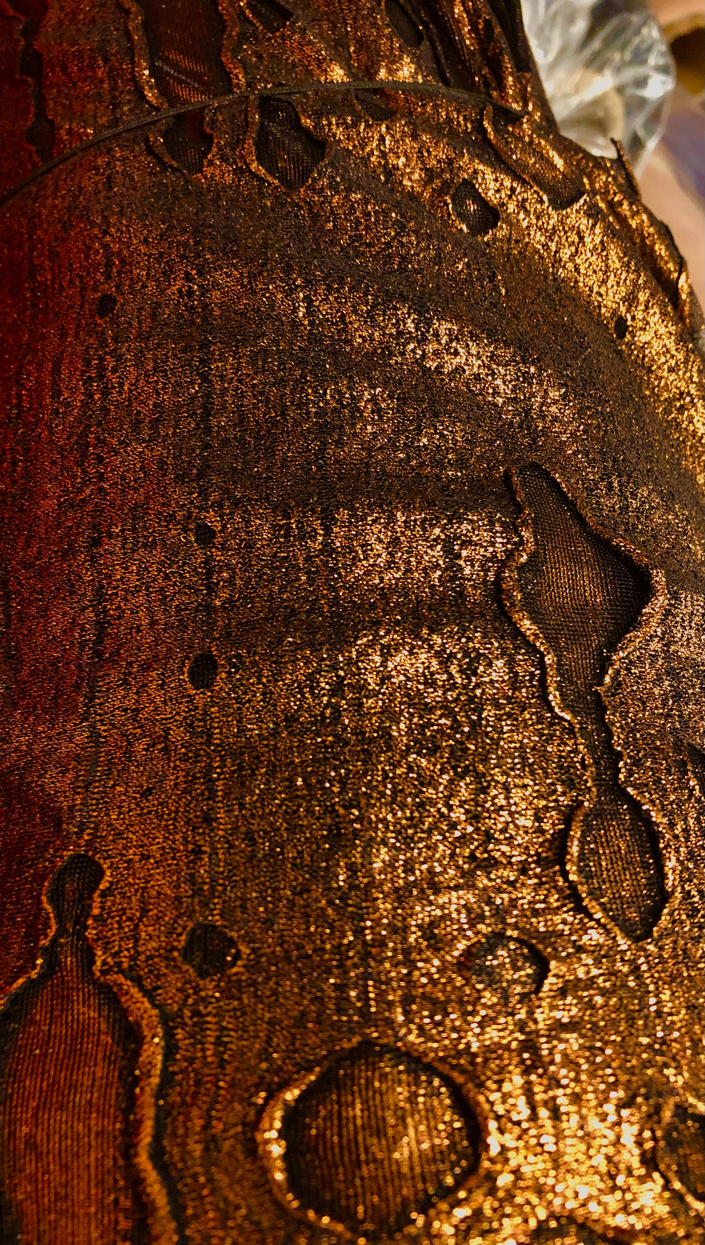 Priced per yard. Copper metallic distressed lycra. 58-inches wide. Great for stretch costumes and leotards.