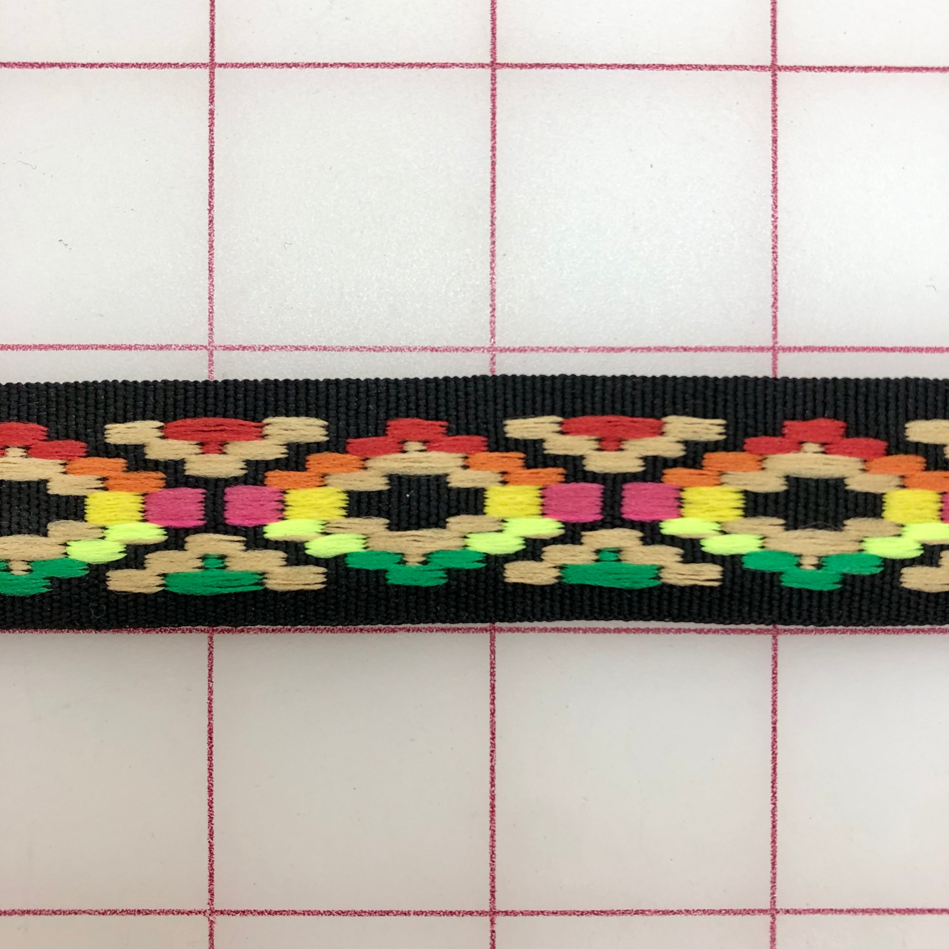 Priced per 4-yard piece. Vintage multi-color embroidered ribbon trim. 3/4-inch wide. Close-Out. Cannot be re-ordered.