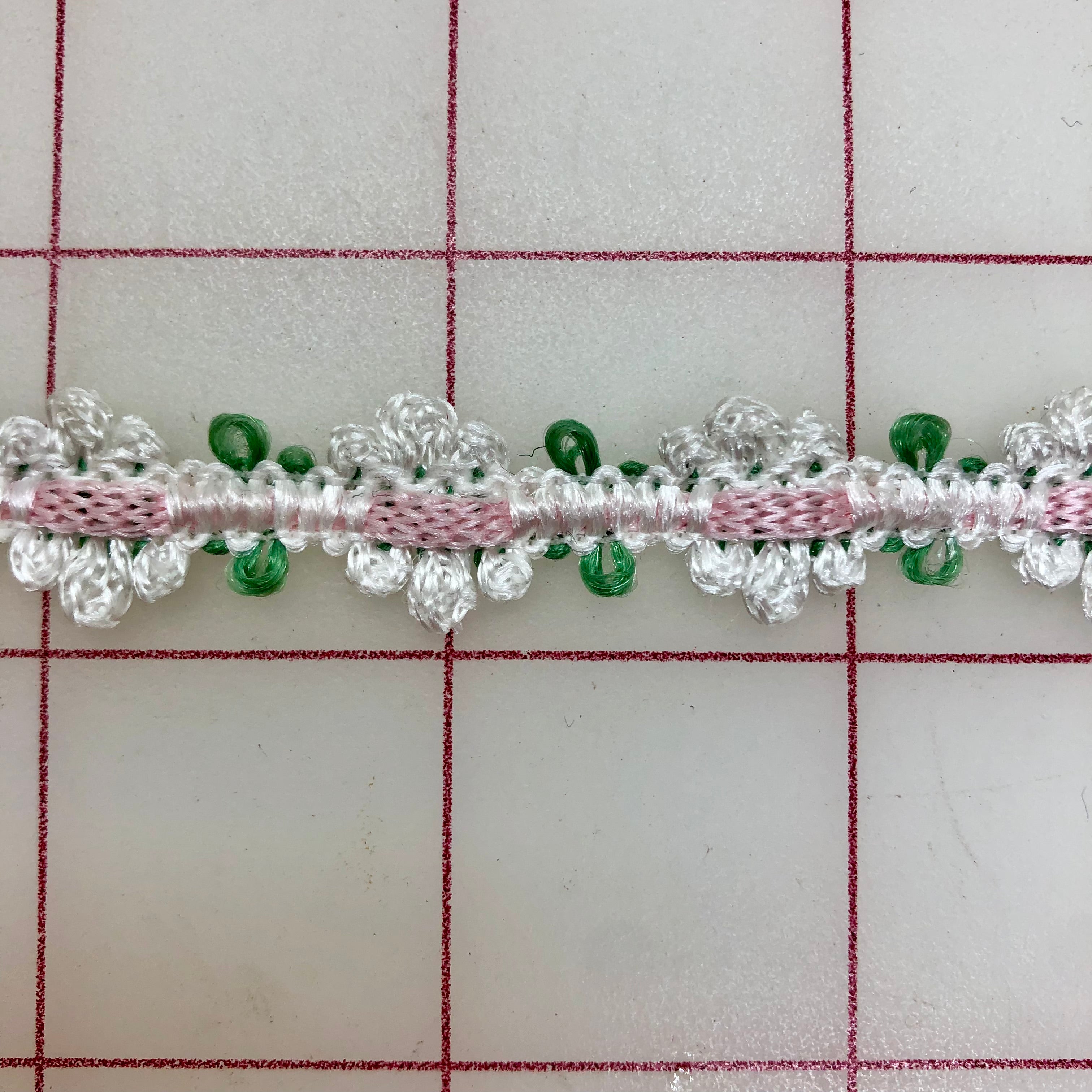 Priced per yard. 1/2-inch. White, green and peach flower trim.