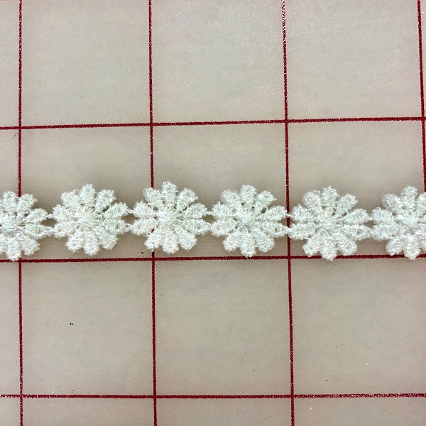 Priced per yard. 57 flowers per yard that can be easily cut apart and used for accents on tutu plates and bodices. Ivory, 1/2-inch wide.