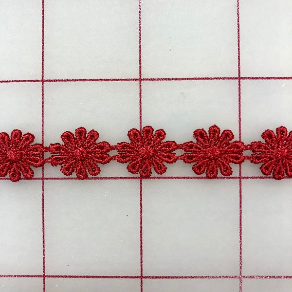 Priced per yard. 57 flowers per yard that can be easily cut apart and used for accents on tutu plates and bodices. Red, 1/2-inch wide.