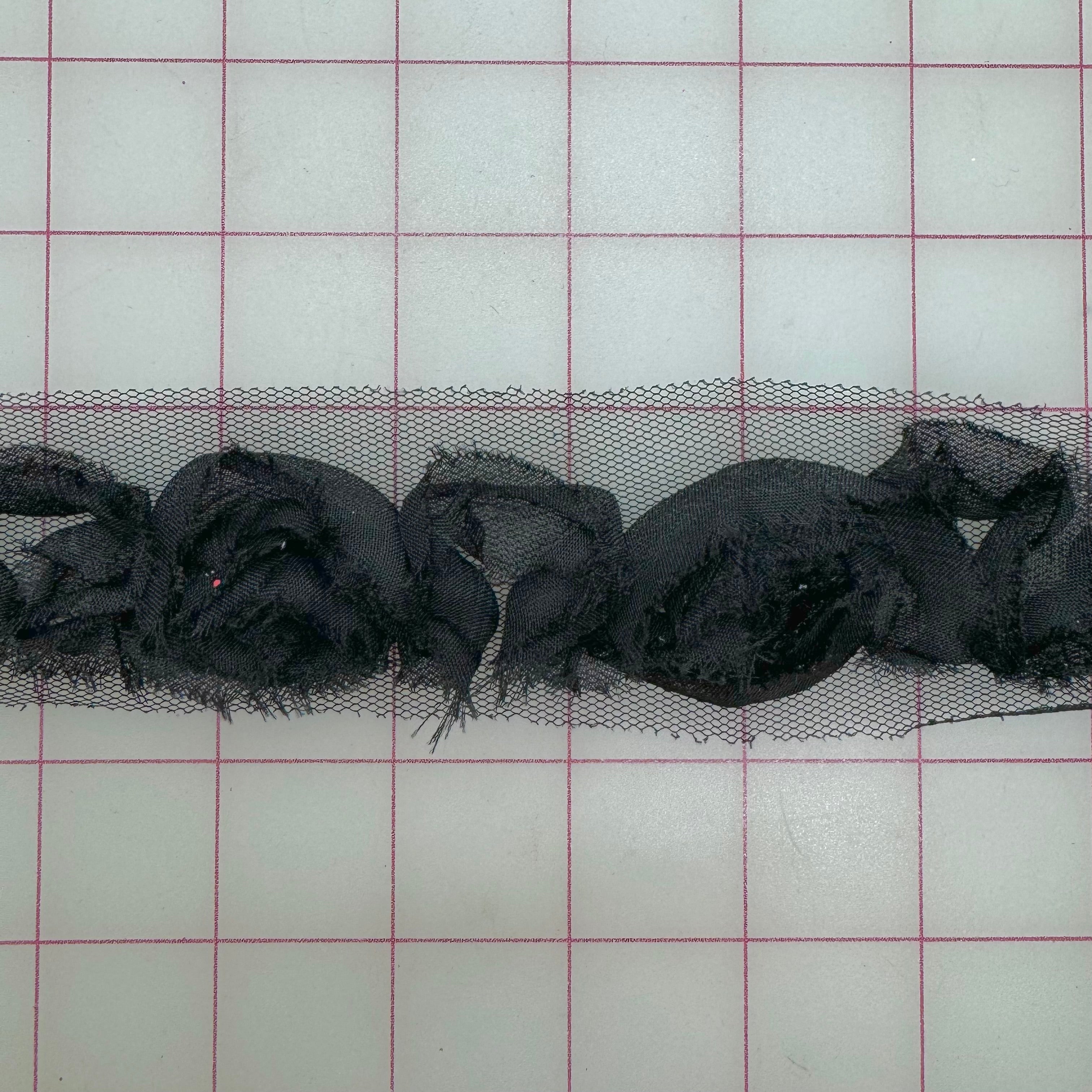 Priced per yard. Black 3D rose trim, 1-inch wide, on 2-inch wide tulle. Beautiful trim!