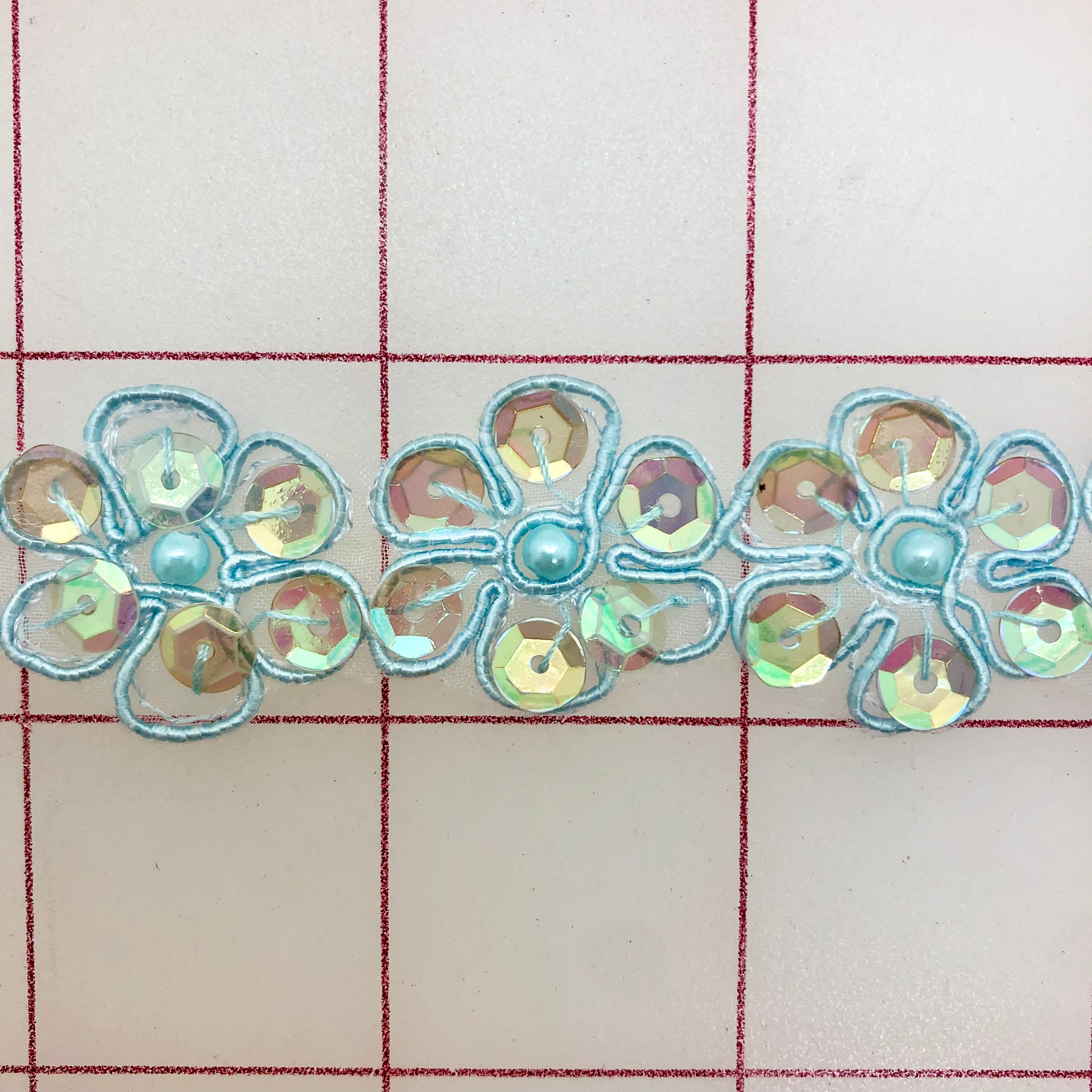 Priced per yard. Beautiful sequined flower trim. Lightweight. Light Blue, 1-inch wide.