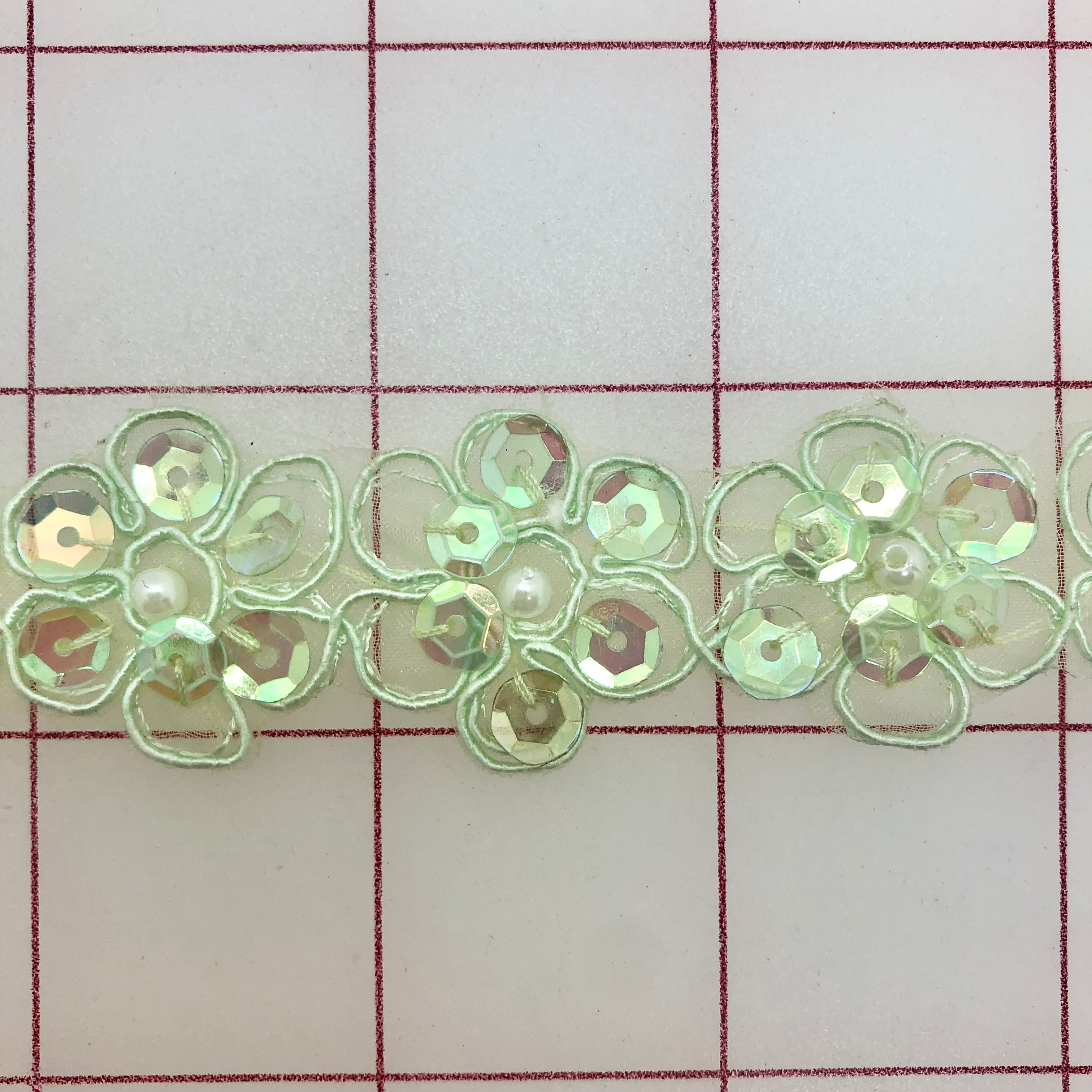 Priced per yard. Beautiful sequined flower trim. Lightweight, perfect for embellishing many costumes. Mint Green, 1-inch wide.
