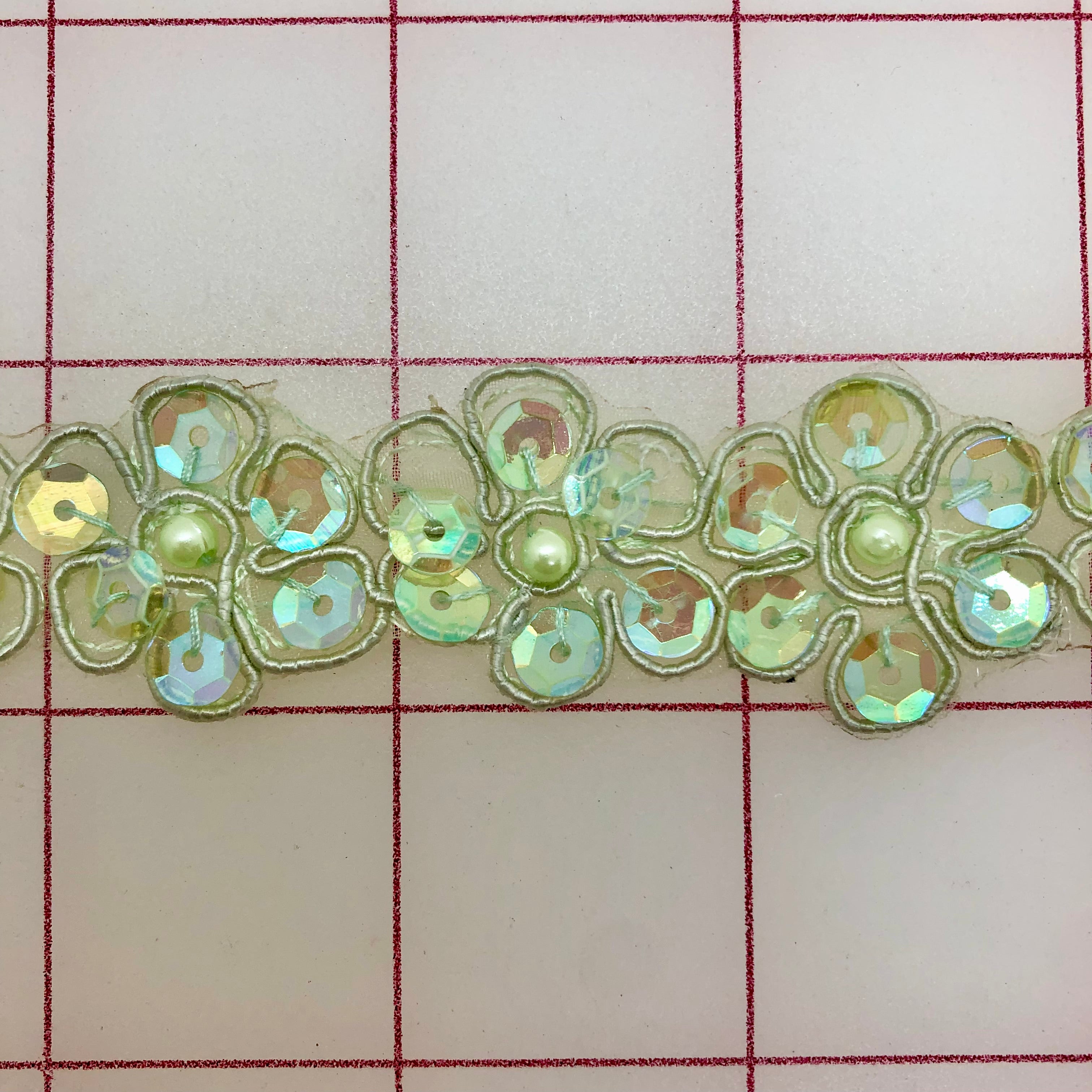 Priced per yard. Beautiful sequined flower trim. Lightweight, perfect for embellishing many costumes. Sage Green, 1-inch wide.