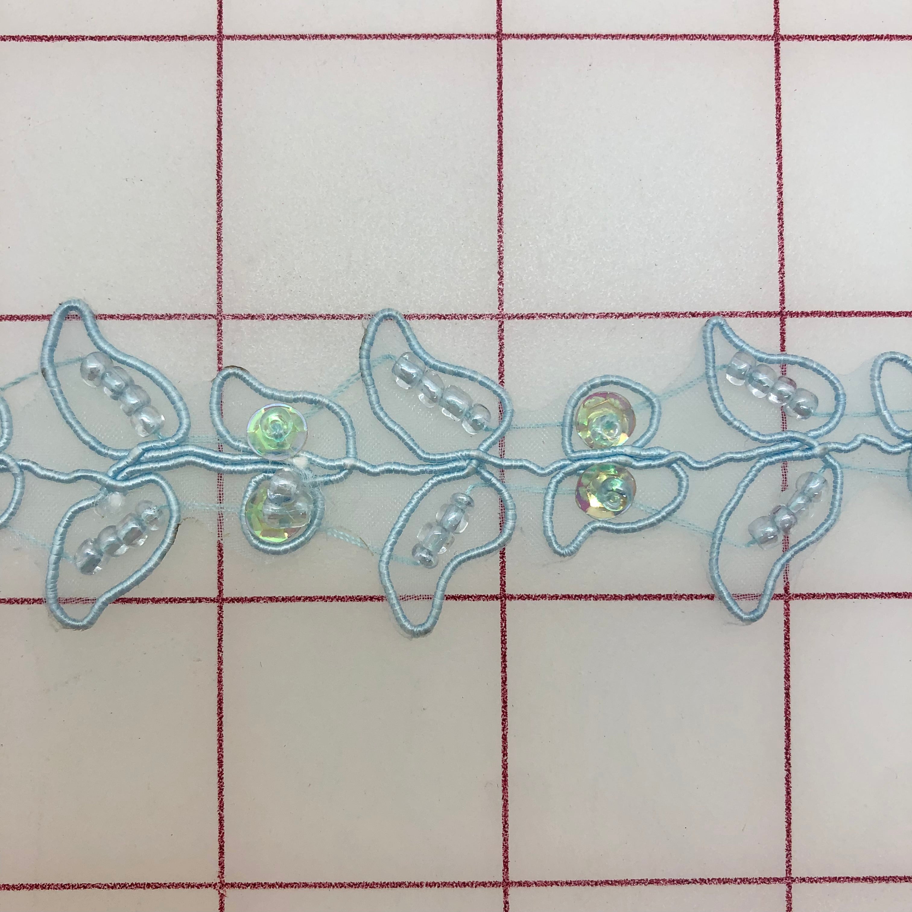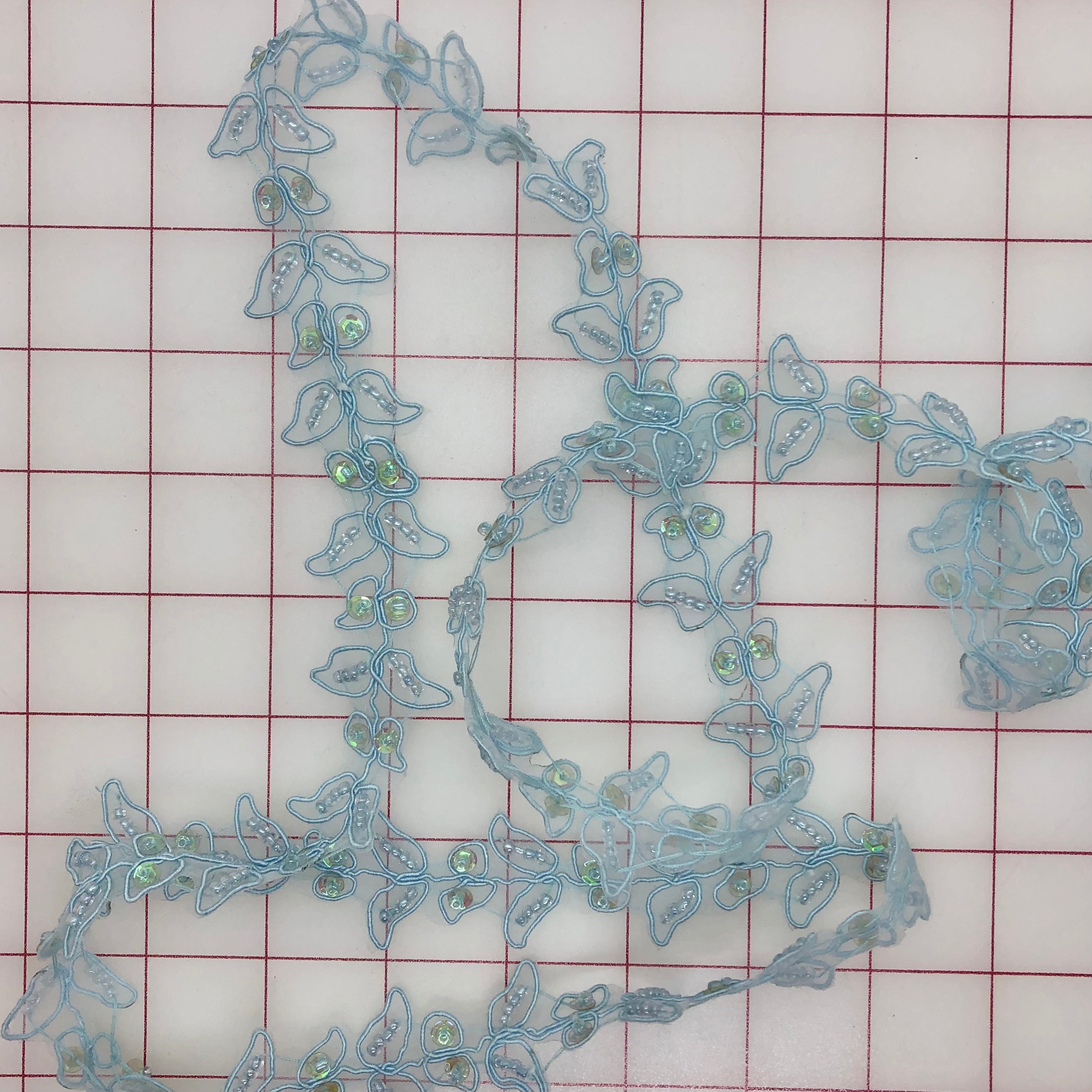 Priced per yard. Beautiful sequined trim. Lightweight, perfect for embellishing many costumes. Light Bluer, 1-inch wide.