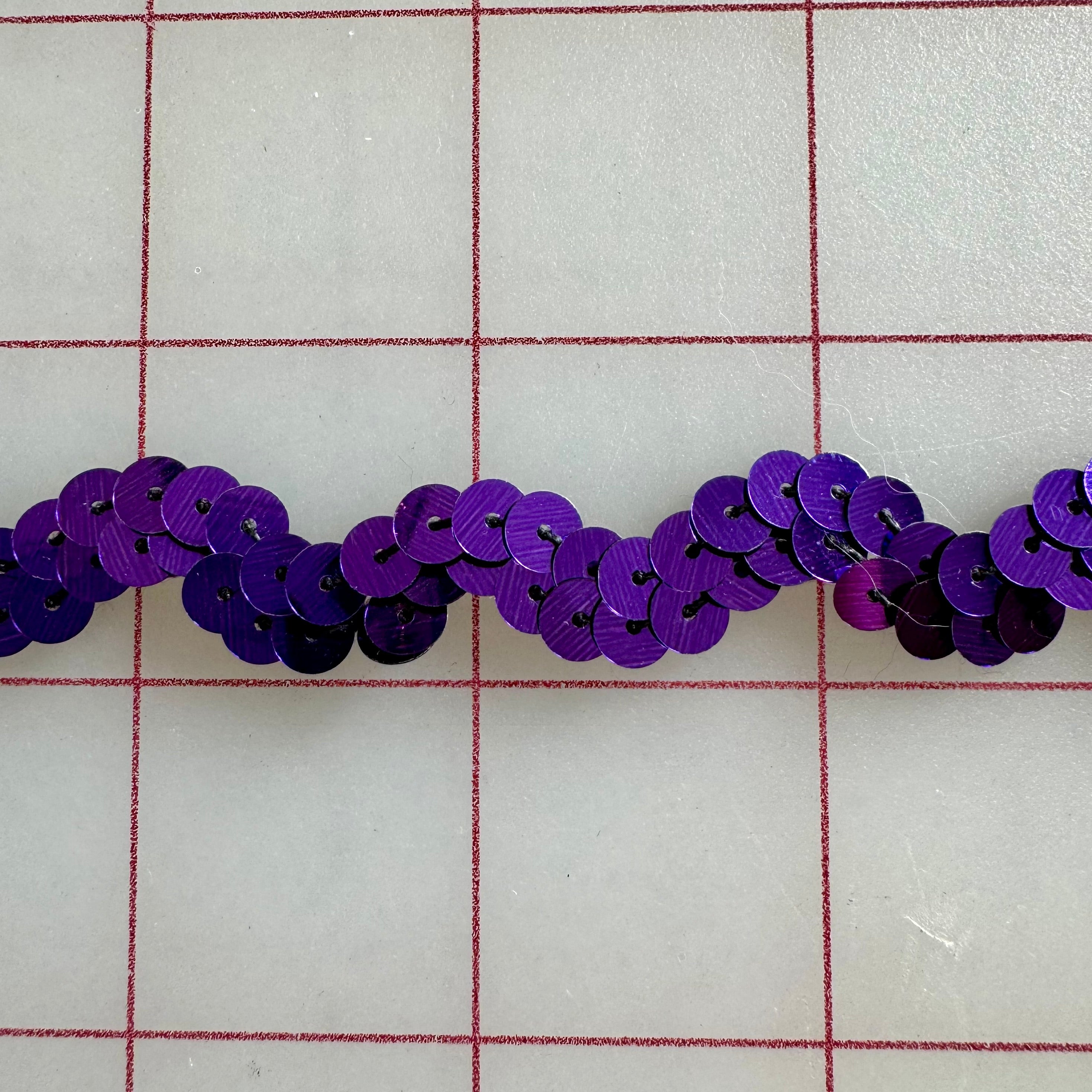 Priced per yard. Beautiful purple sequined trim. Lightweight, perfect for embellishing many costumes. Scalloped-shape, approximately 1/2-inch wide.