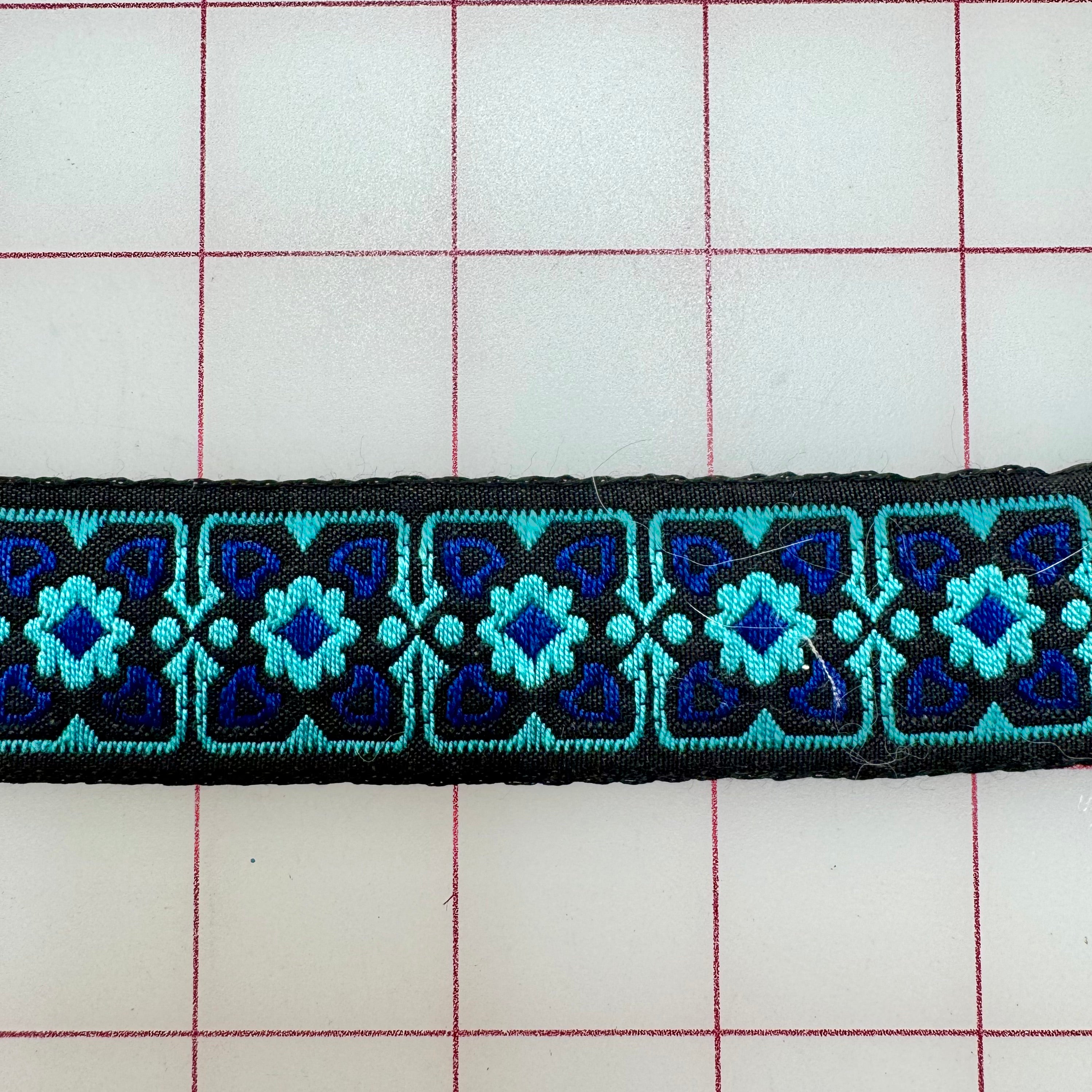 Priced per yard. Navy blue and turquoise with black background. 1-inch wide. Close-Out. Cannot be re-ordered.