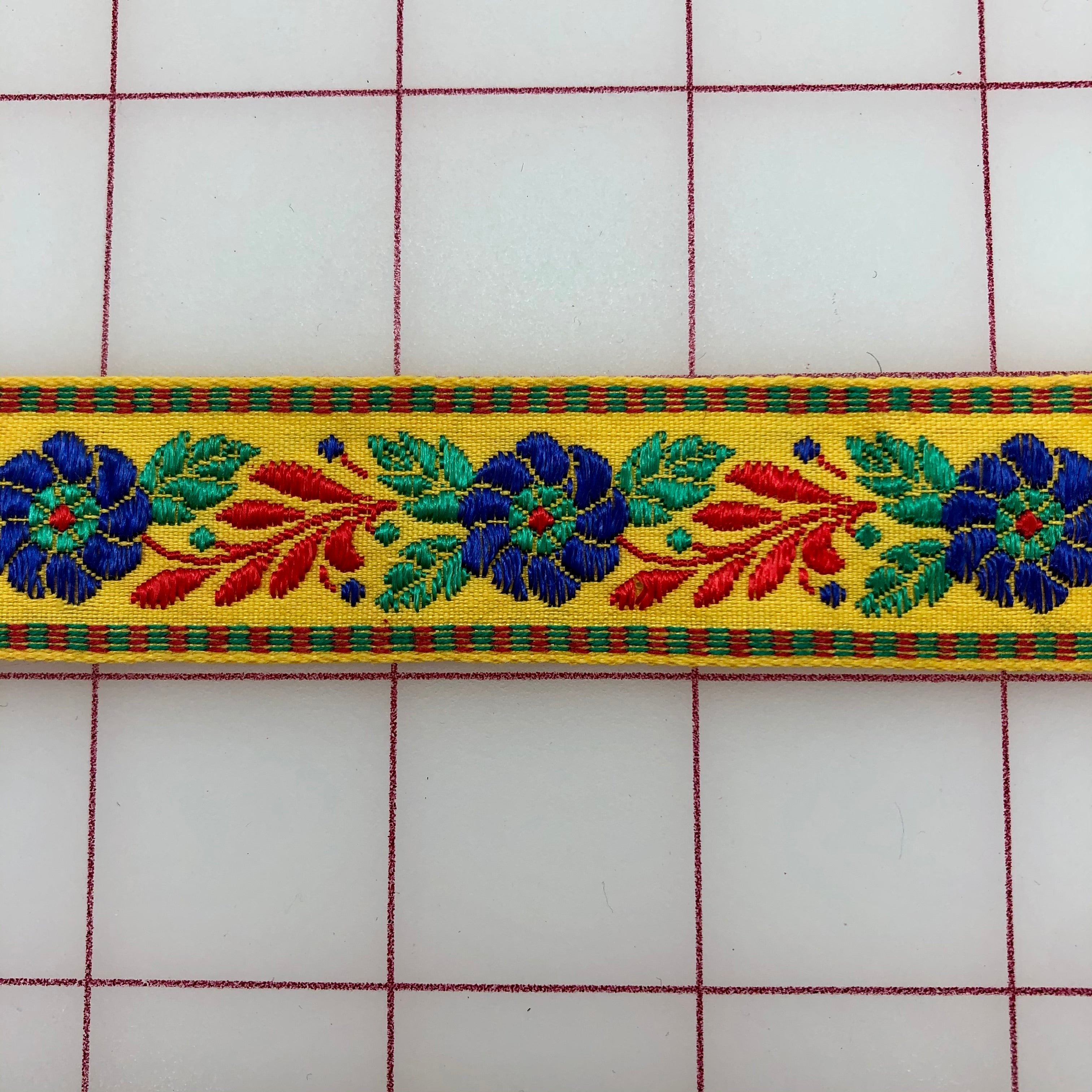 Priced per 1.5 yard piece. Vintage golden yellow embroidered ribbon trim. 1-inch wide.
