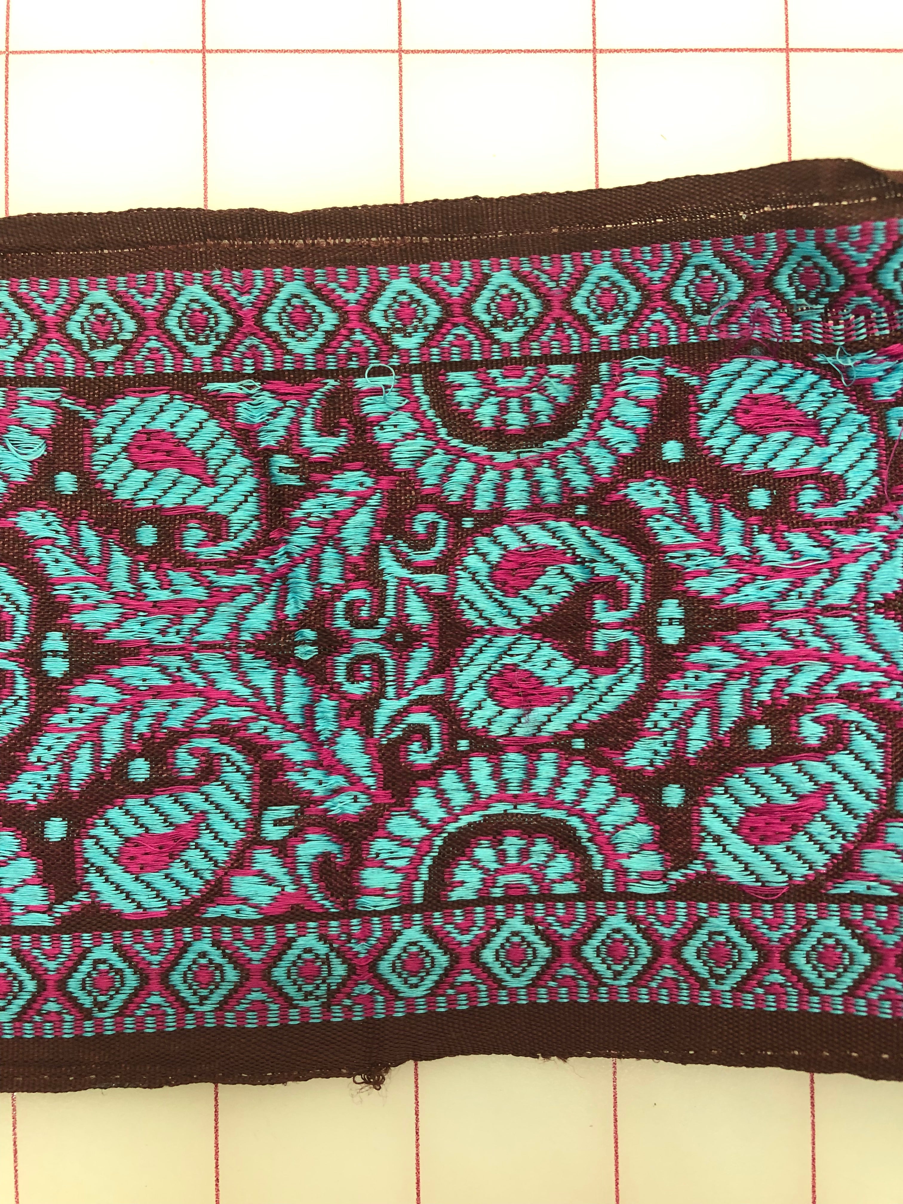 Priced per 4.5-yard piece. Vintage Copen, Fuchsia, and Burgundy Embroidered Ribbon Trim.