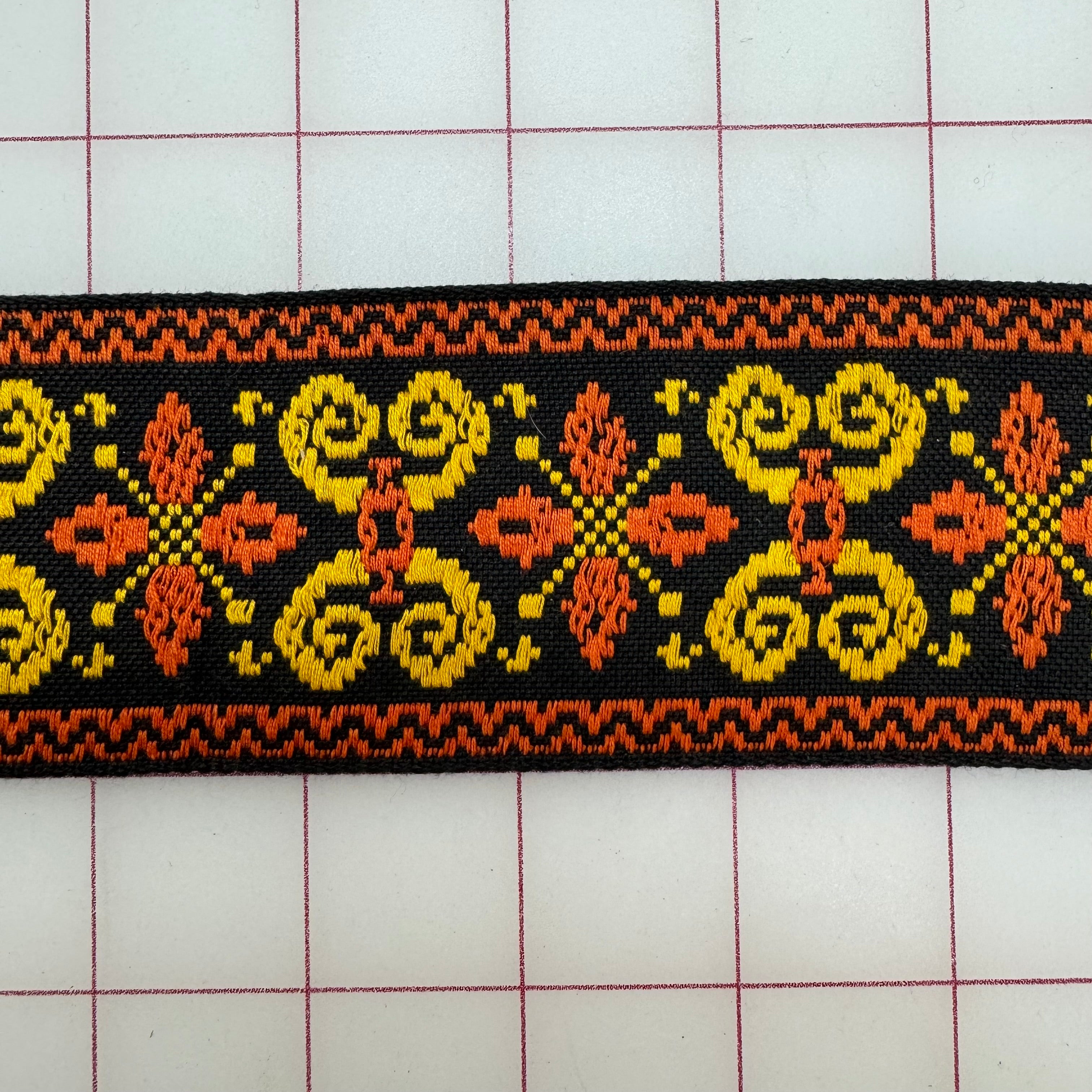 Priced per 1.75-yard piece. Vintage black with orange and golden yellow embroidered ribbon trim. 2.25-inches wide. Close-Out. Cannot be re-ordered. Perfect for peasant-style costumes.