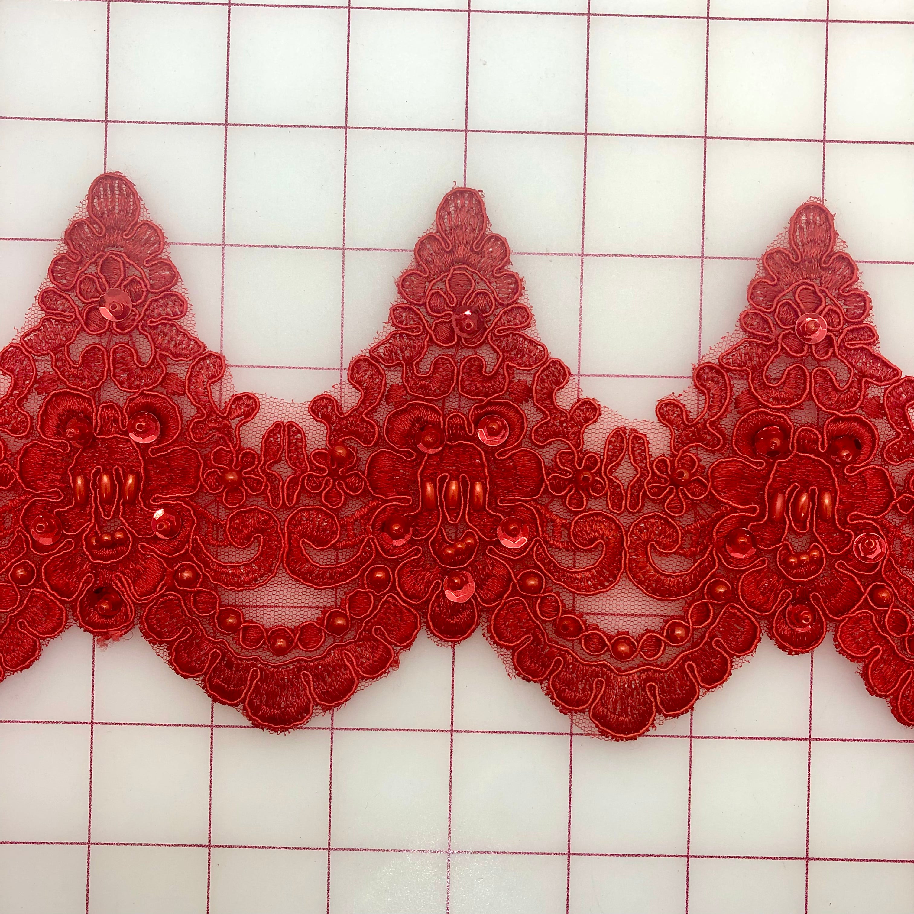 Priced per yard. Beautiful border trim. 4.25-inch wide. Red beaded and sequined. Can be easily cut into smaller motifs. For size: Each square equals one-inch.