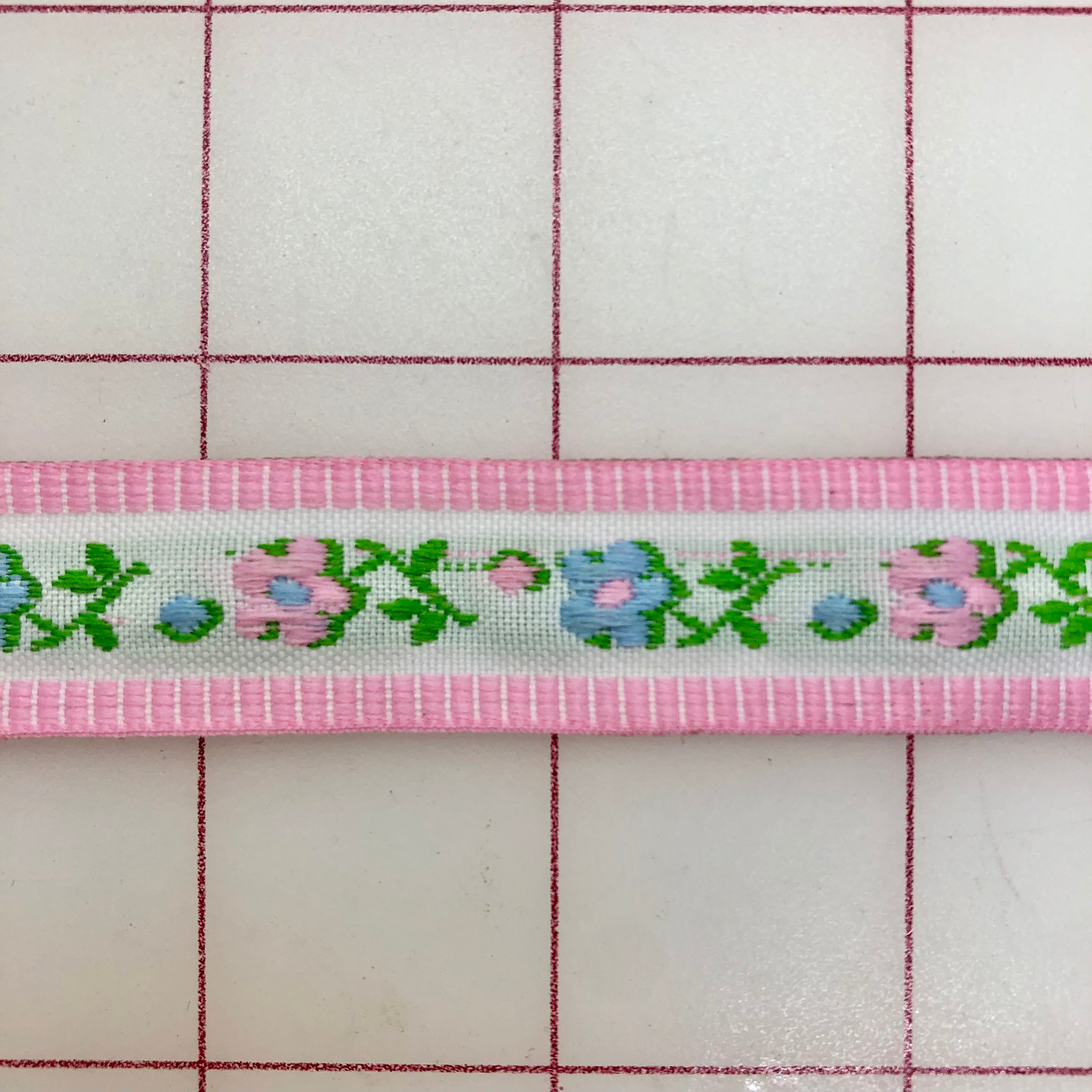 Priced per yard. Non-metallic pink ribbon with flower pattern. 3/4-inch wide.