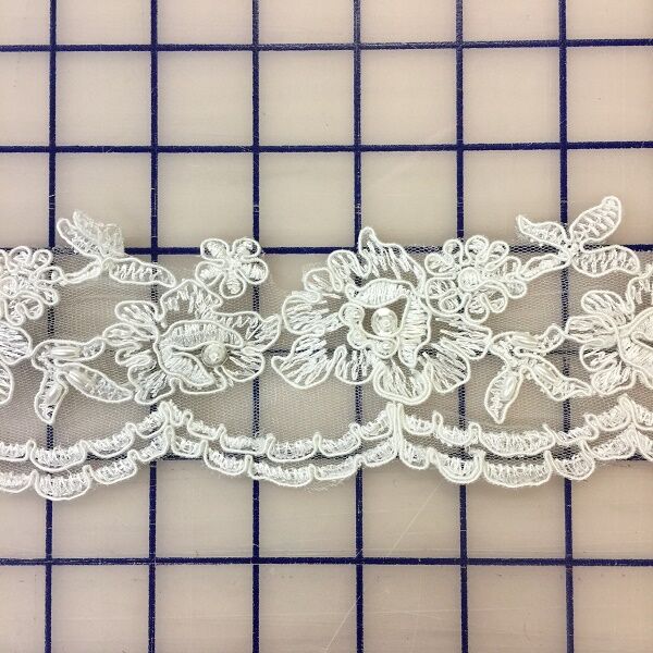 Priced per yard. White beaded and sequined non-metallic trim. 3-inches wide.