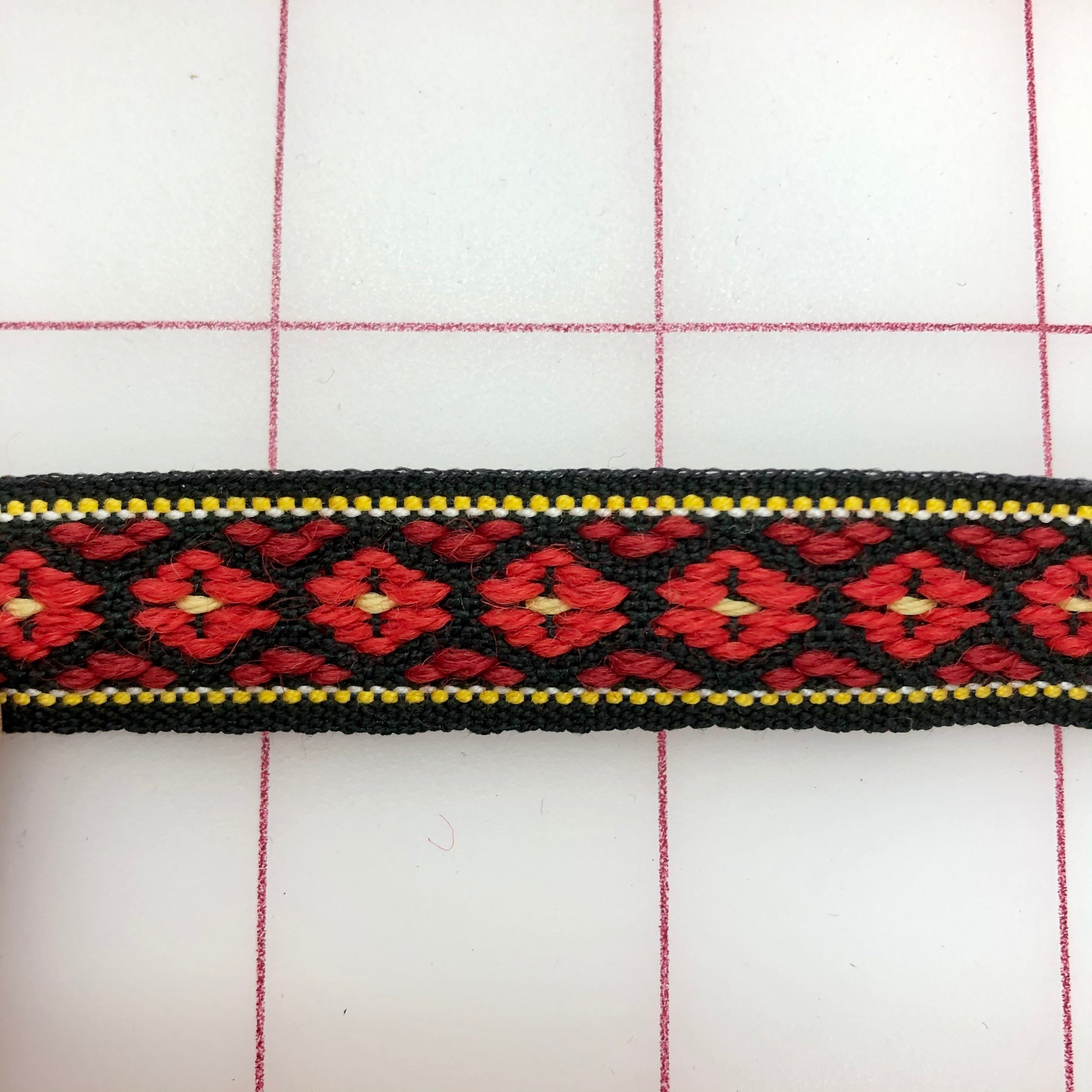 Priced per 3.125-yard piece. Vintage red and black embroidered trim. .625-inch wide.