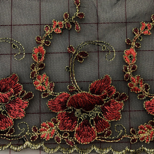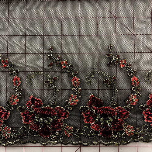 Reversible embroidered black tulle with red flower embroidery. 9-inches wide. Great for Spanish-flavored costumes.