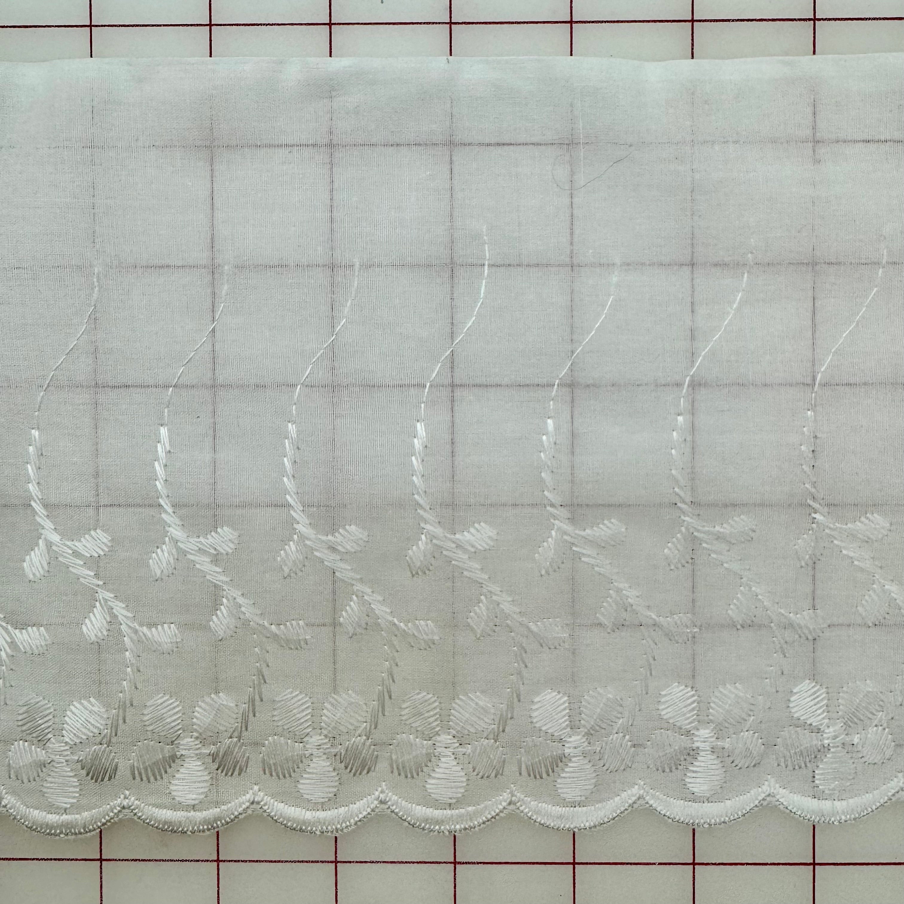 Priced per yard. Beautiful, scalloped embroidered trim. 7-inches wide.