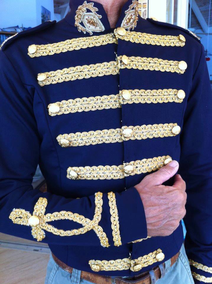 Designed by Jeremy Bernardoni, this Men's Nutcracker Soldier Jacket is made with stretch fabric. It has the option of set-in sleeves, or sleeves set on a separate powernet undervest. The jacket closes in the front, and has military-style gold embellishments.