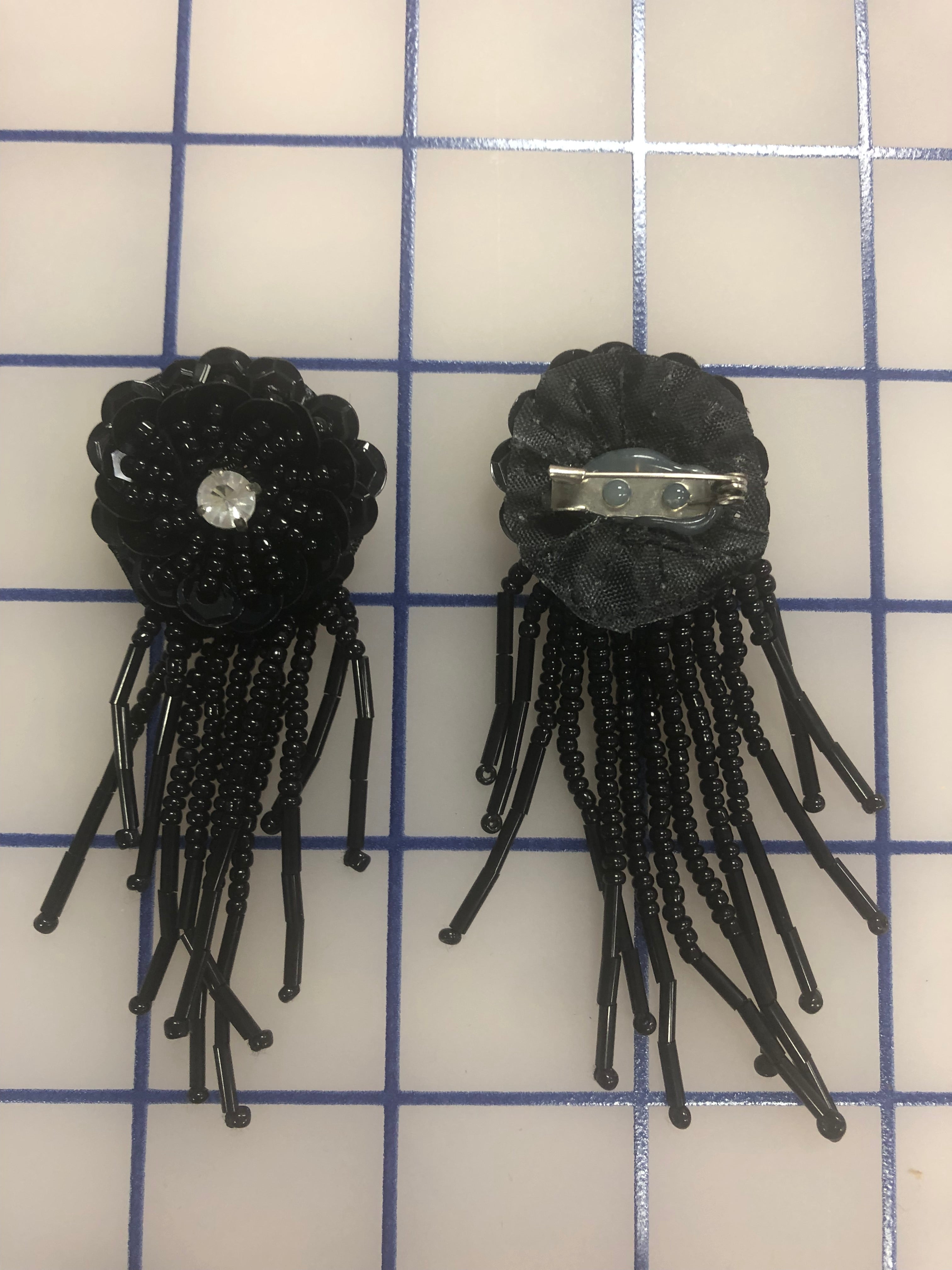 Priced per piece. Black beaded and sequined pin with crystal rhinestone center.