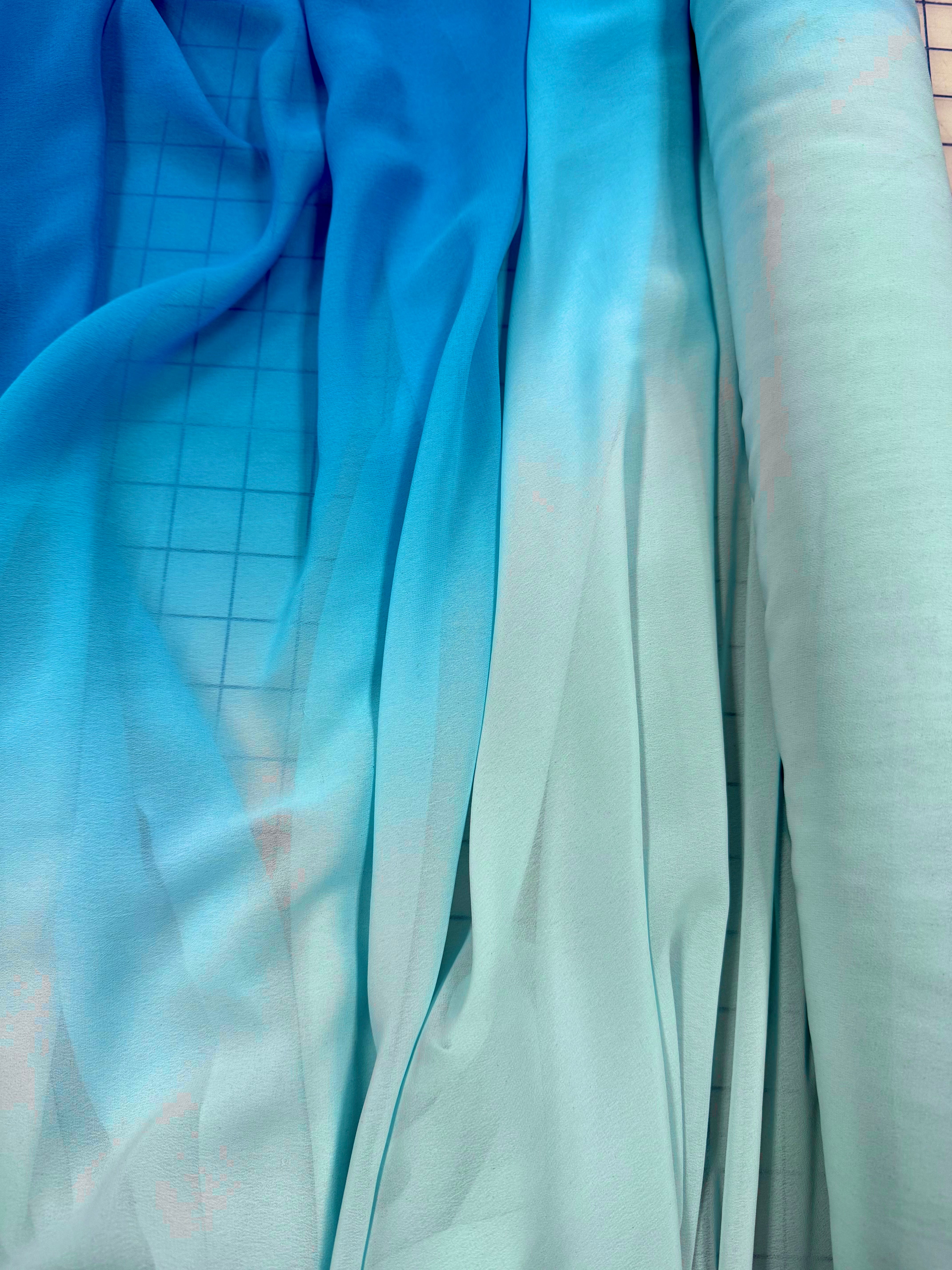 Priced per yard. Aqua to turquoise, 56-inches wide. Beautiful top quality soft ombre chiffon.