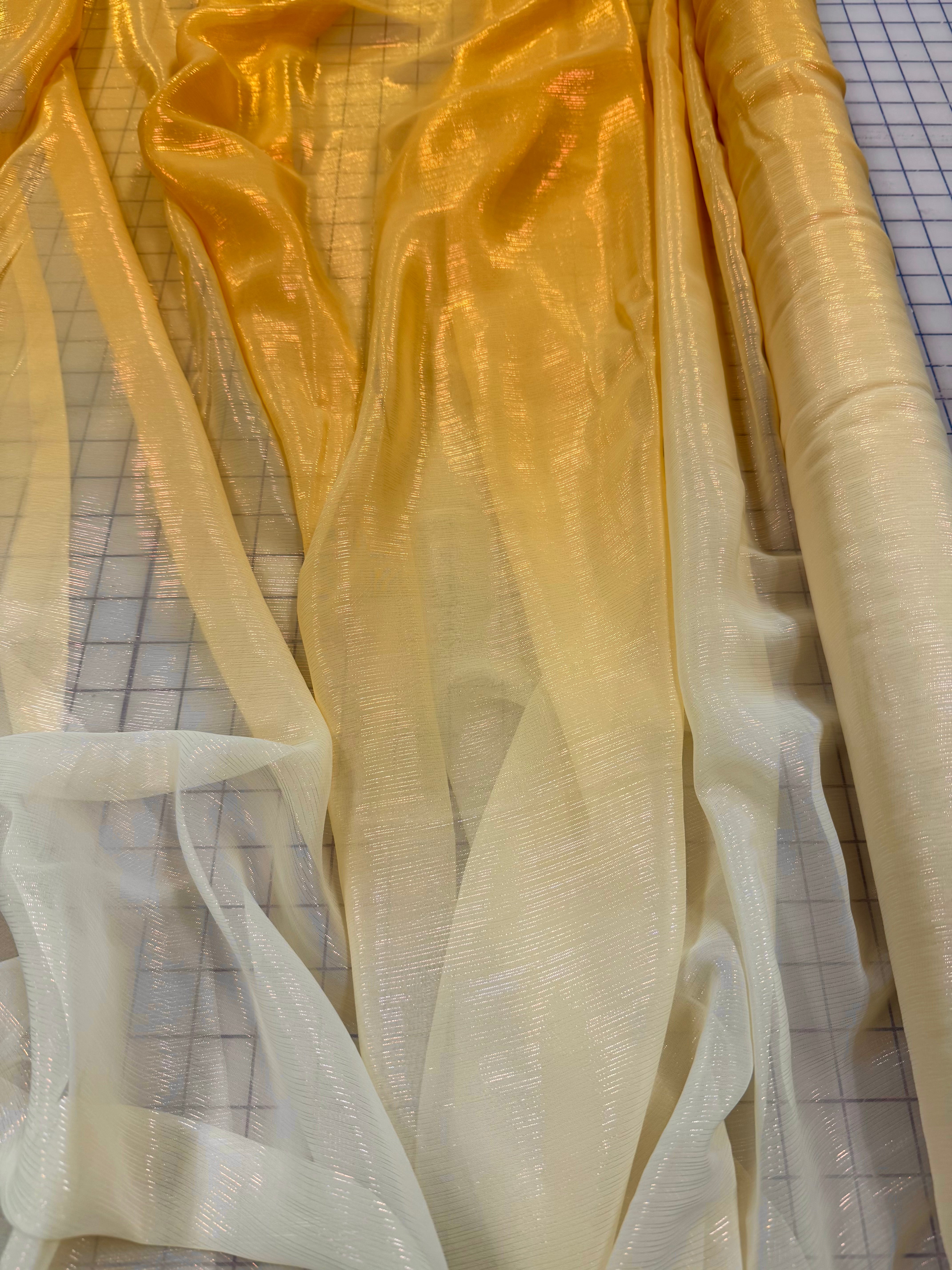 Priced per yard. Ivory to gold with metallic threads running through it, 56-inches wide. Beautiful top quality chiffon shot with pale golden metallic threads.