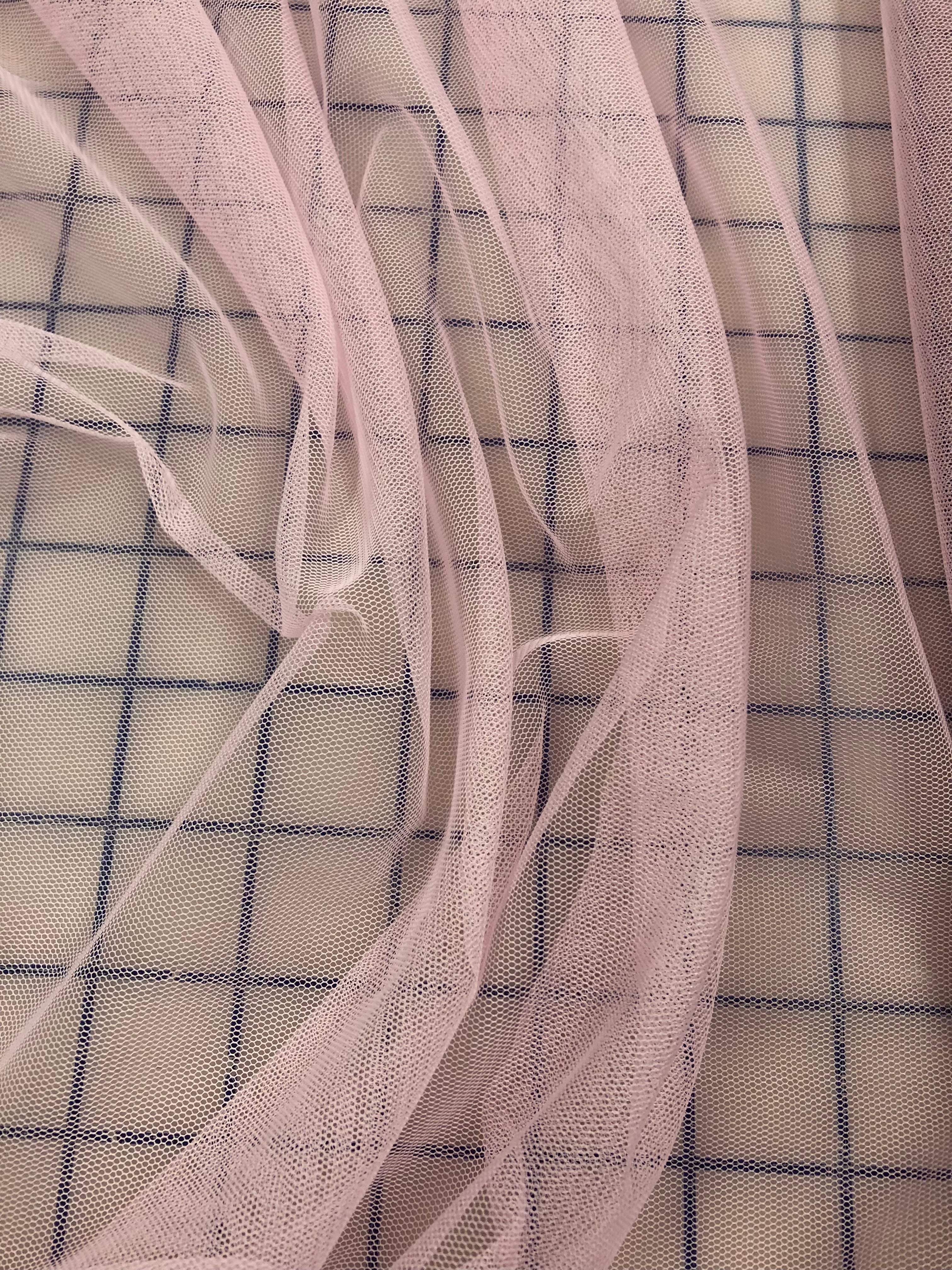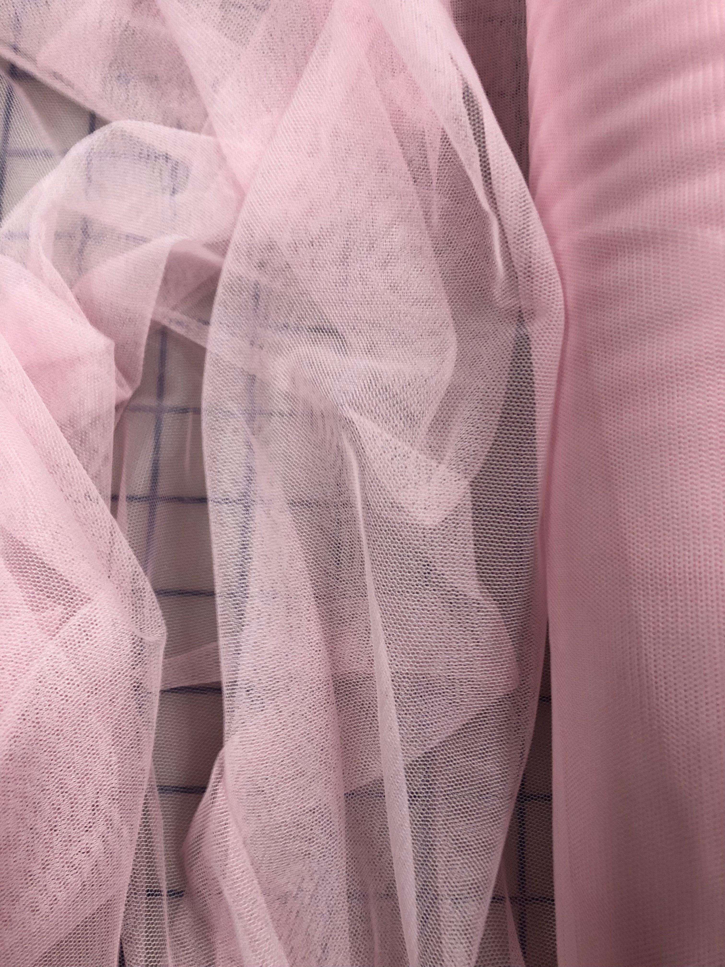 Priced per yard. Light Pink. 100% polyester. This tulle has a little stretch across the width of the fabric.