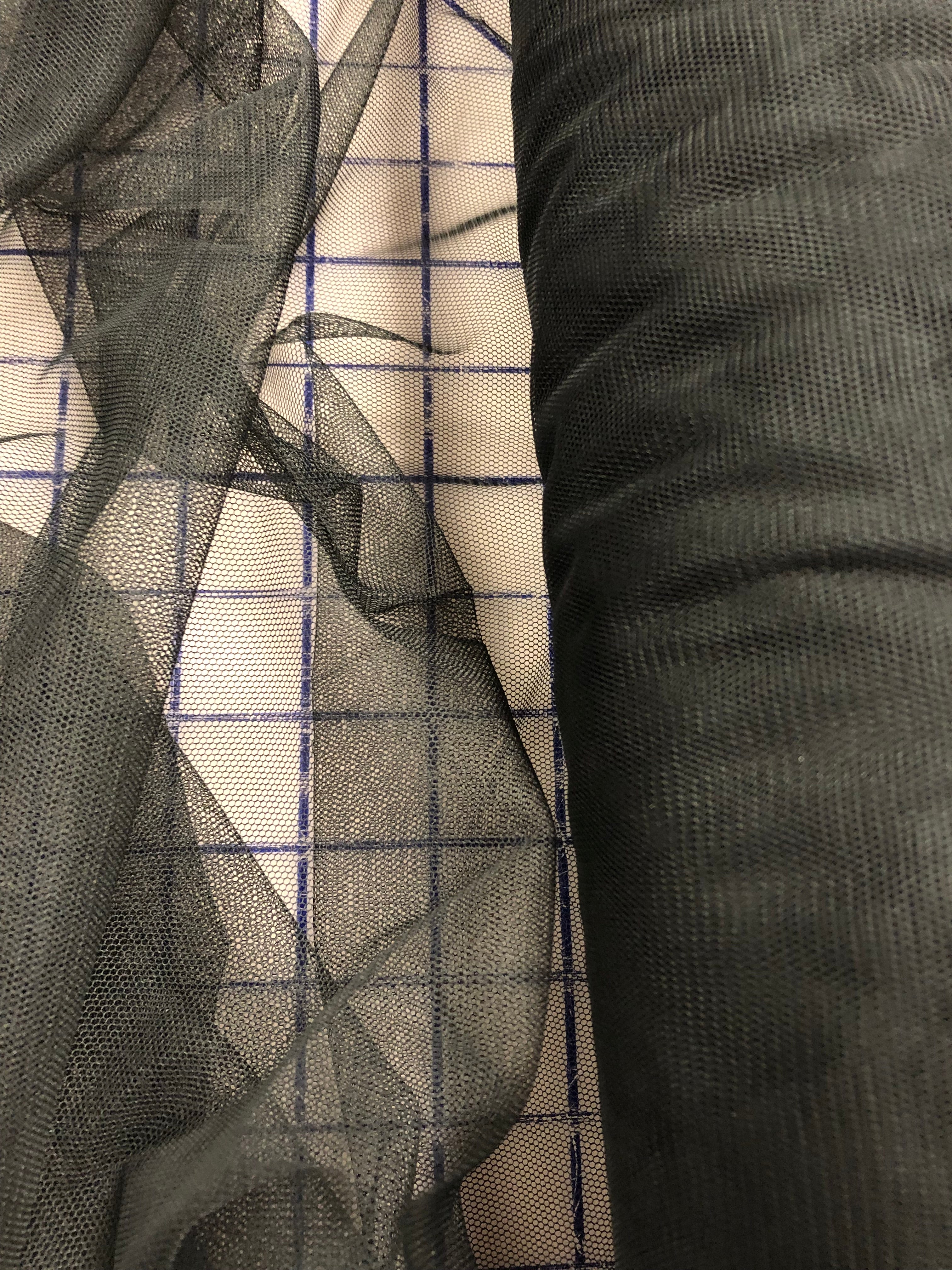 Priced per yard. Black. 100% polyester. This tulle has a little stretch across the width of the fabric. It is perfect for insets in bodices and other costumes. Also works well for tutu knickers/panties if doubled.  59/60-inches wide.