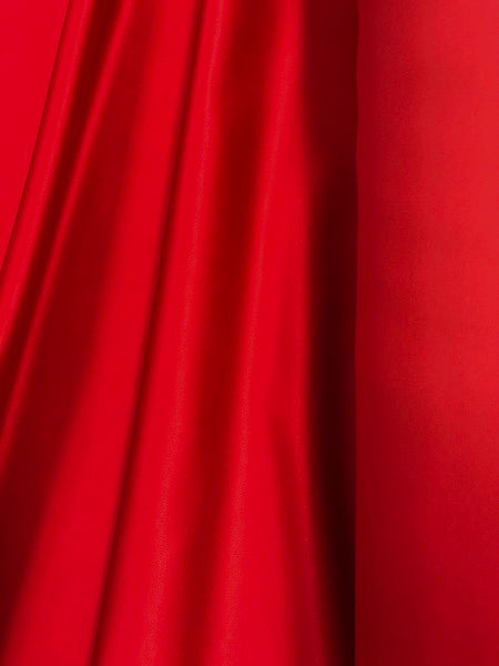 Priced per 25-yard roll. 63-inch Wide, red. 100% Polyester. This is a matte-finish, high-quality, durable fabric. This is a tightly-woven, but lightweight fabric with a strong, dense structure that can withstand daily wear and tear well, making it an excellent choice that works well for ballet bodices, peasant skirts, etc. Best used lined with coutil since it is a lightweight fabric.