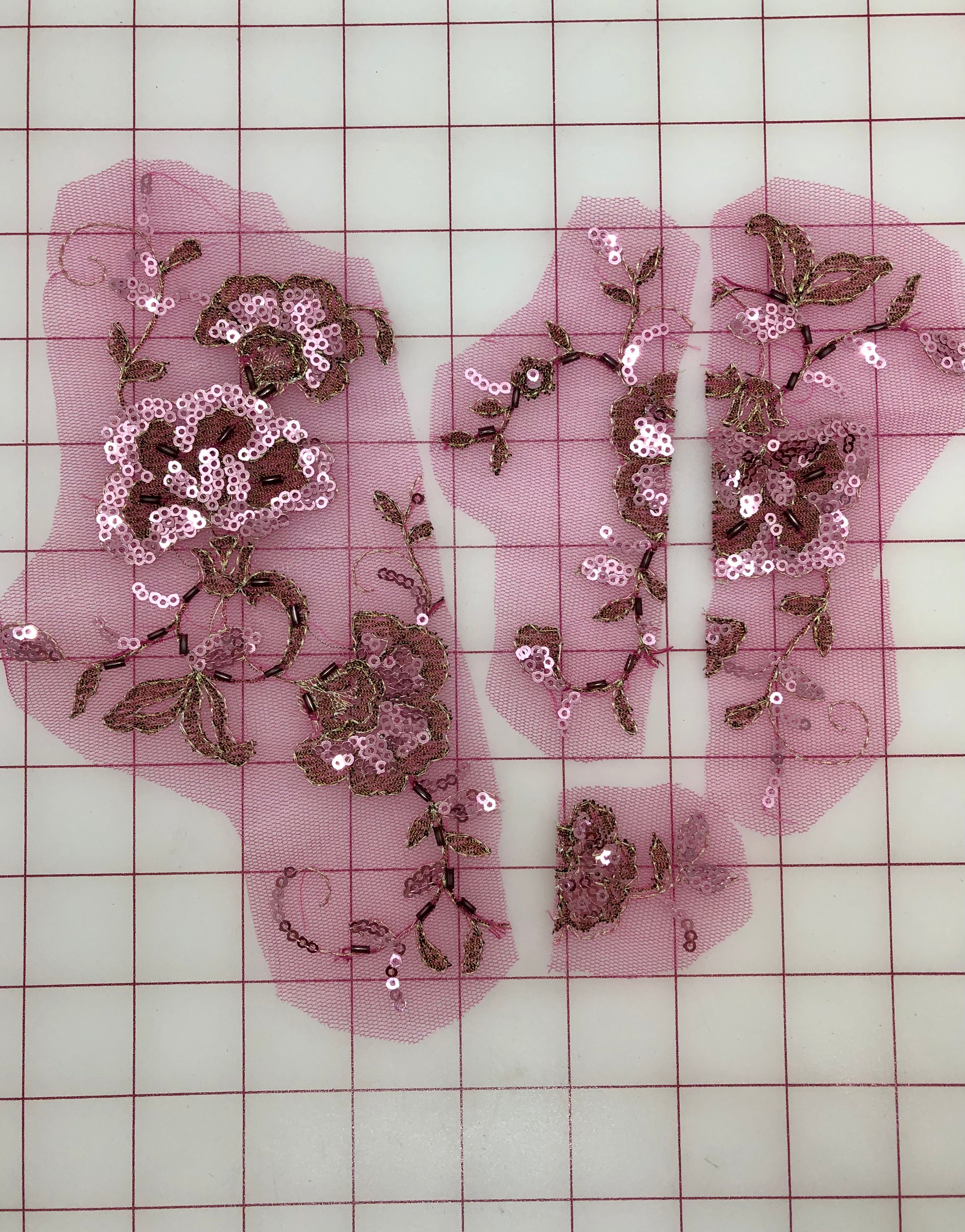 Priced per 4-piece pack. Delicate embroidered and sequined, pink and copper flower-design motifs set on rose-colored tulle. Lightweight. Perfect for use on many pink shades for tutu embellishment. For size: one square equals one inch.