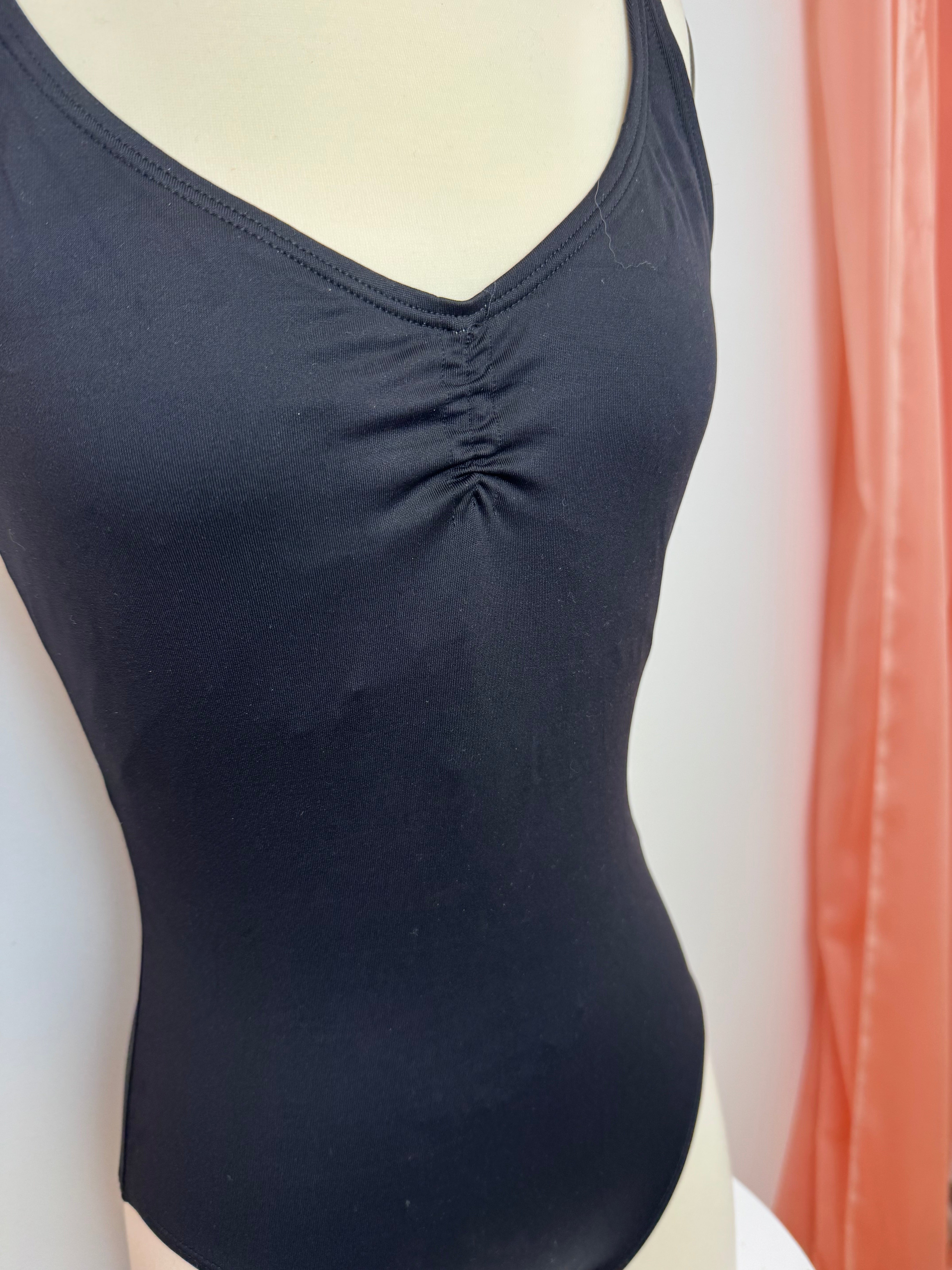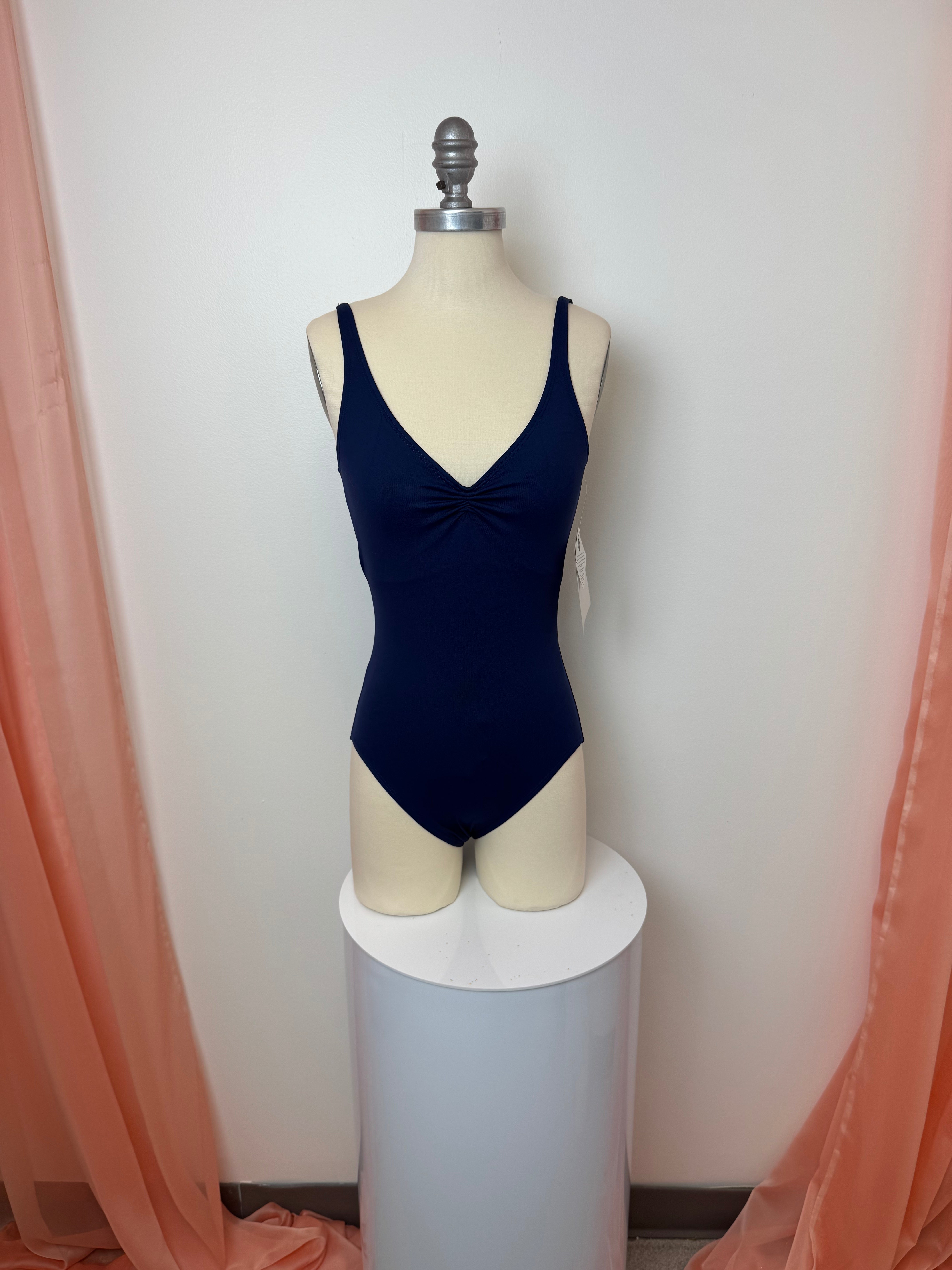 Priced per piece. Gaynor Minden skinny strap camisole leotard. Available in navy and black. Close-Out.
