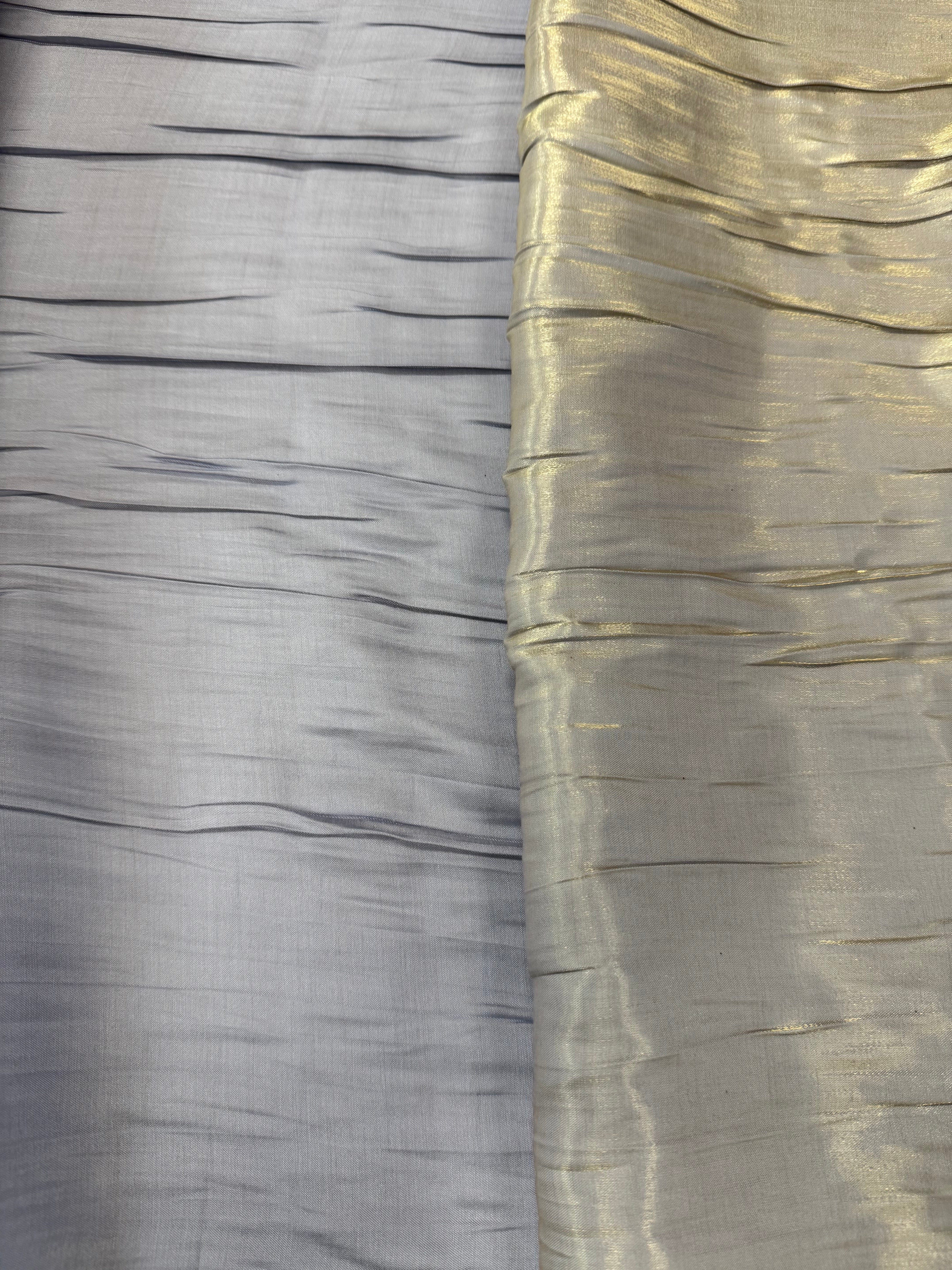 Priced per yard. Iridescent crinkle faille. Two-tone metallic gold/lavender. Beautiful drape! Perfect for dance skirts. The underside is a dull matte (see 2nd picture).
