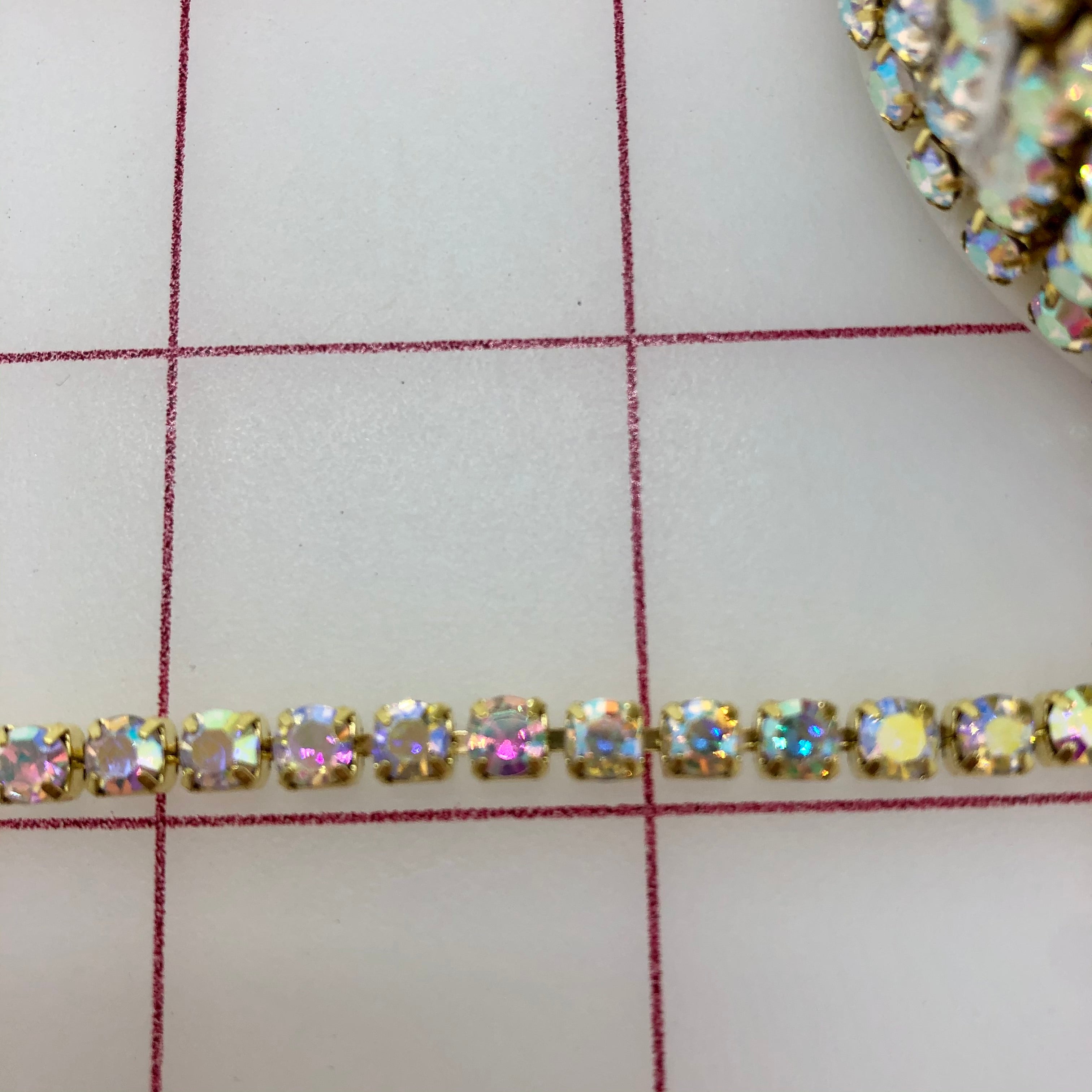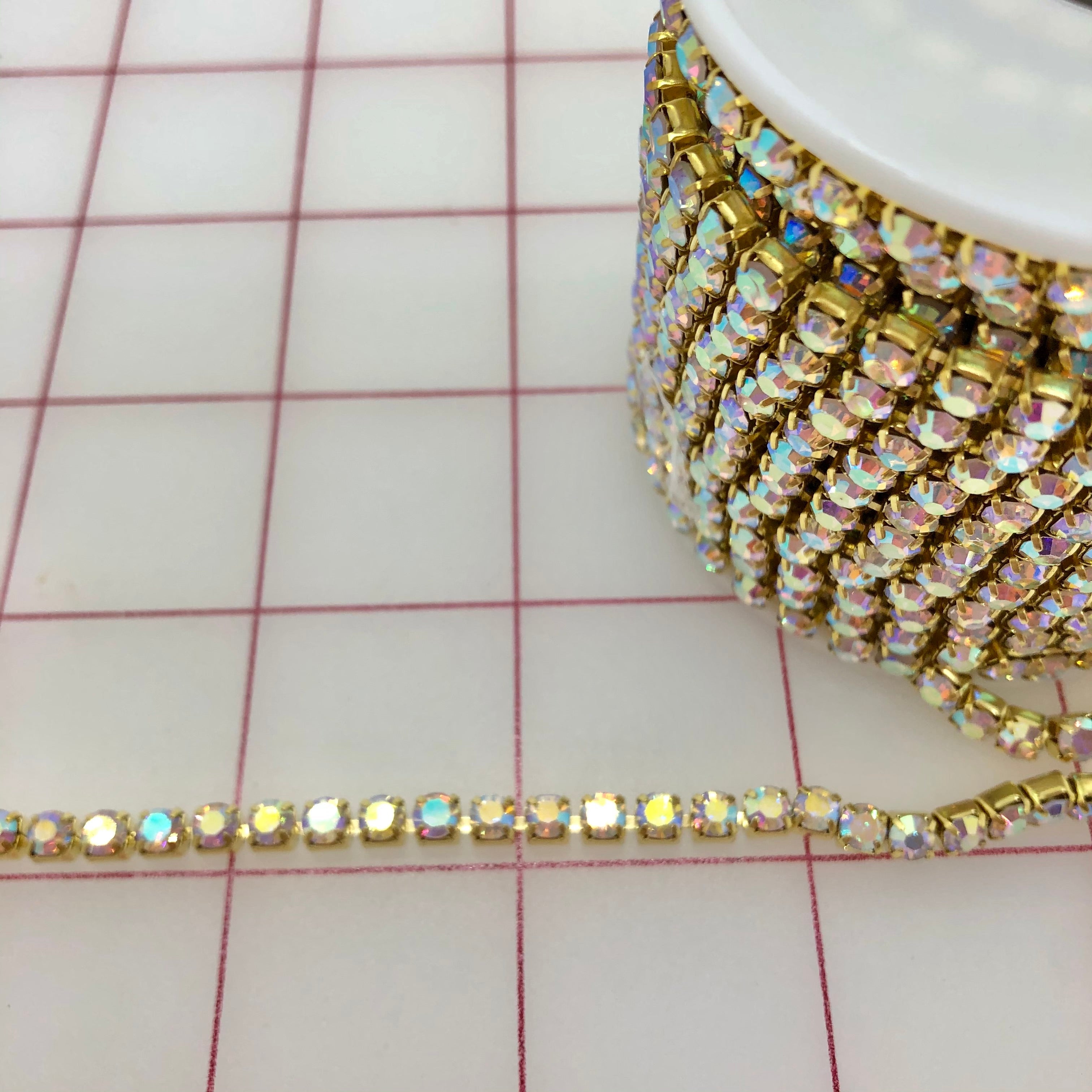 Priced per yard. Crystal AB/Gold cup chain 18ss rhinestones.