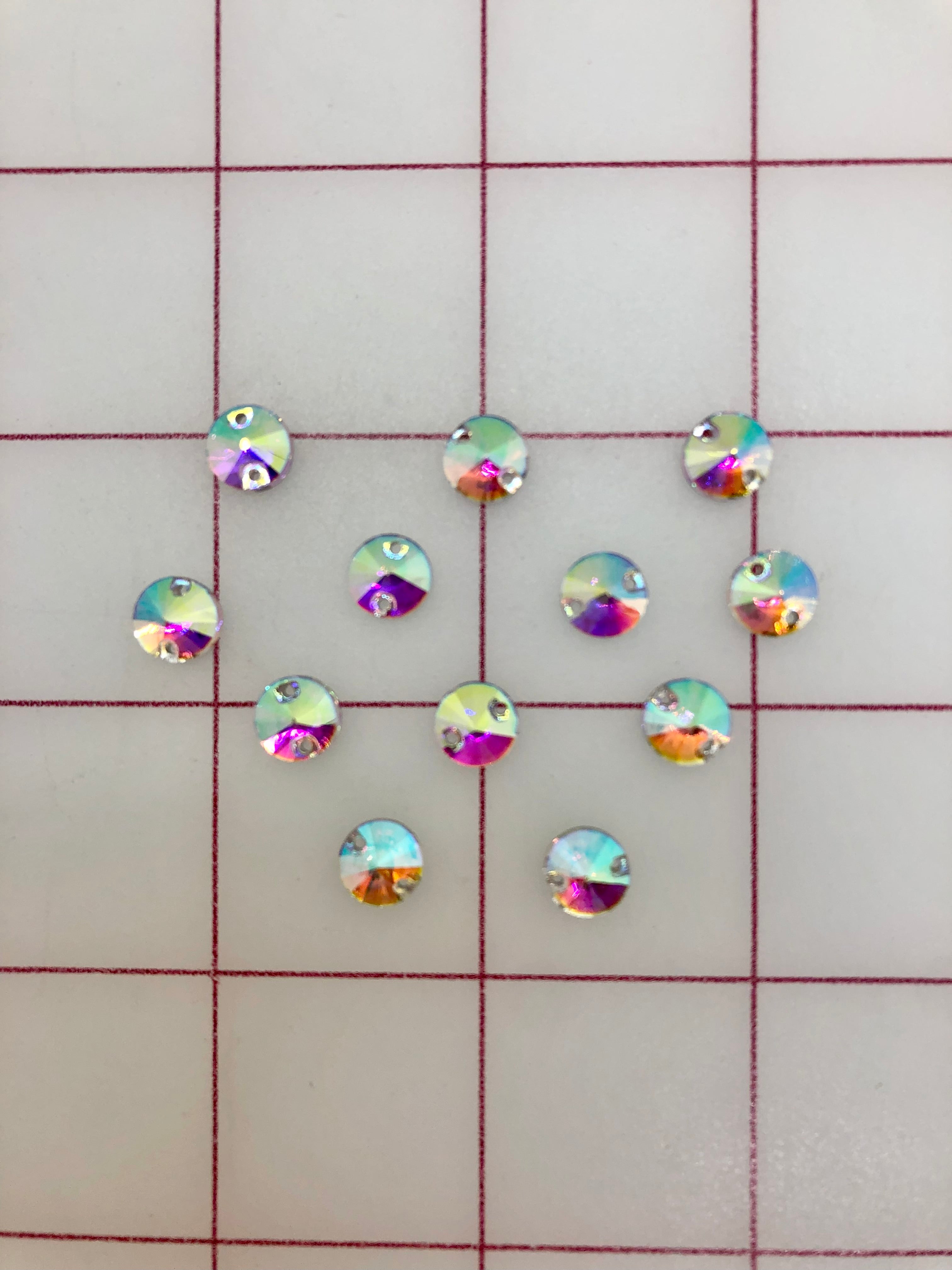 Priced per dozen. 10mm Czech "Bright-Cut" rhinestones. Sew-on, with two holes. Very sparkly!