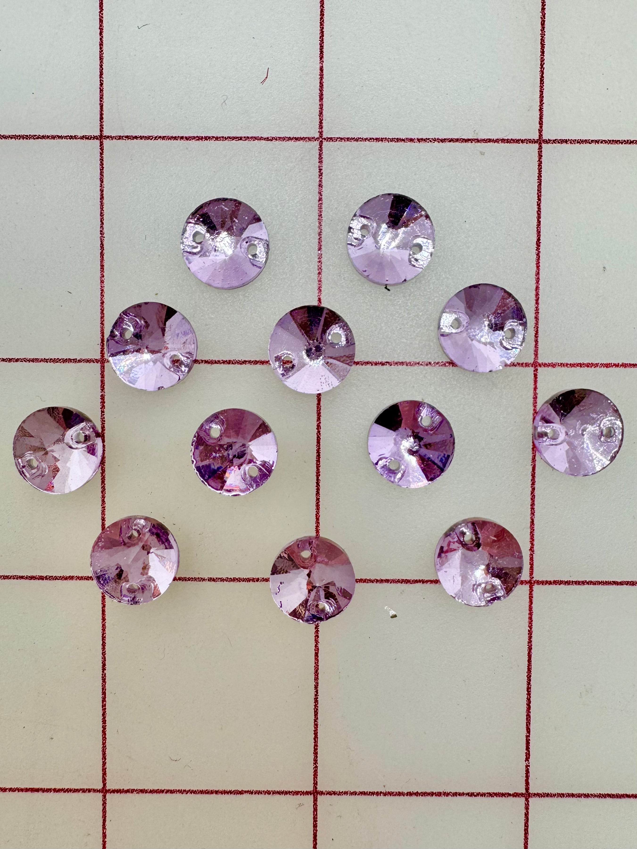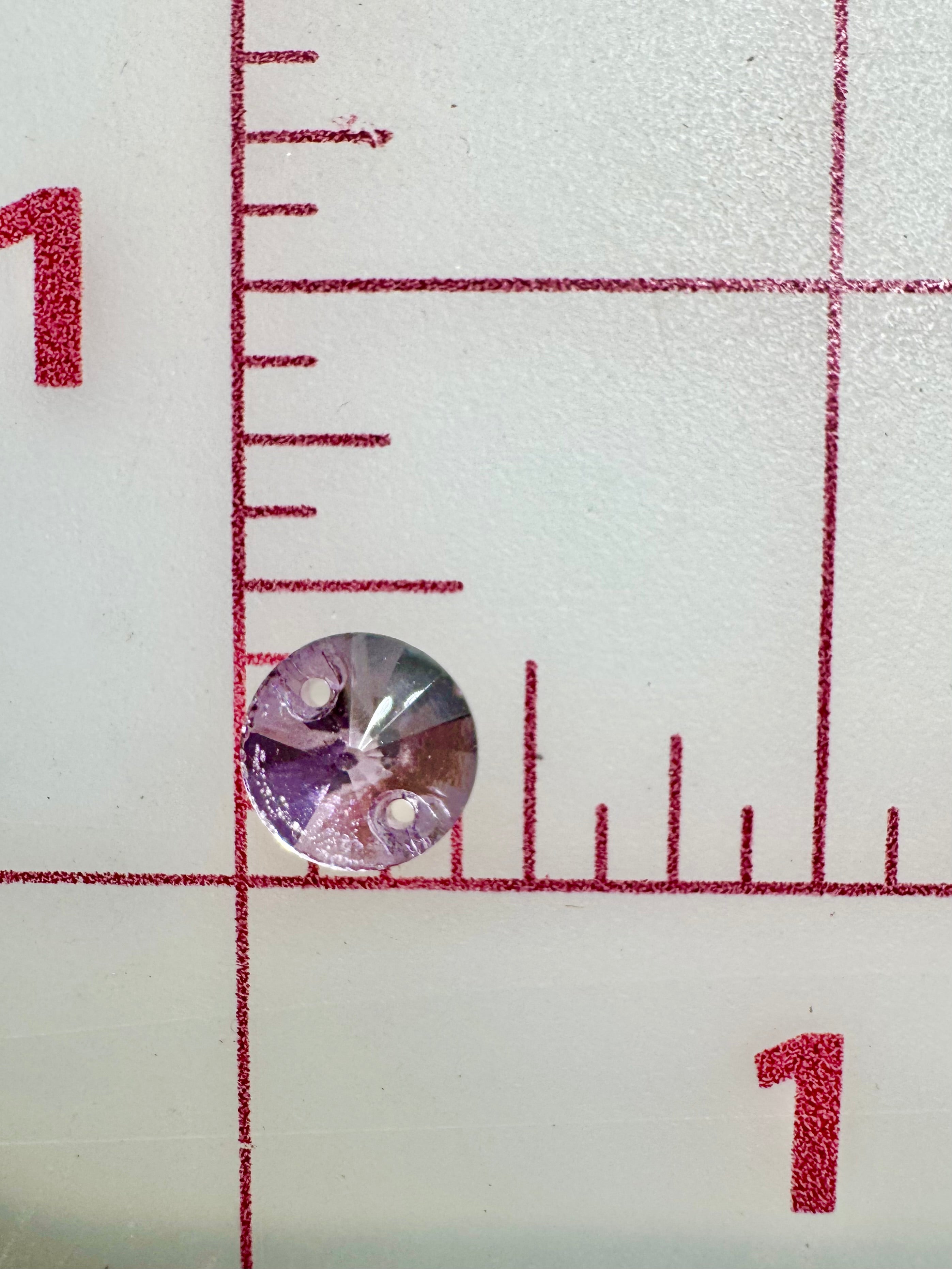 Priced per dozen. 10 mm Czech "Bright-Cut" rhinestones. Sew-on, with two holes. Very sparkly!