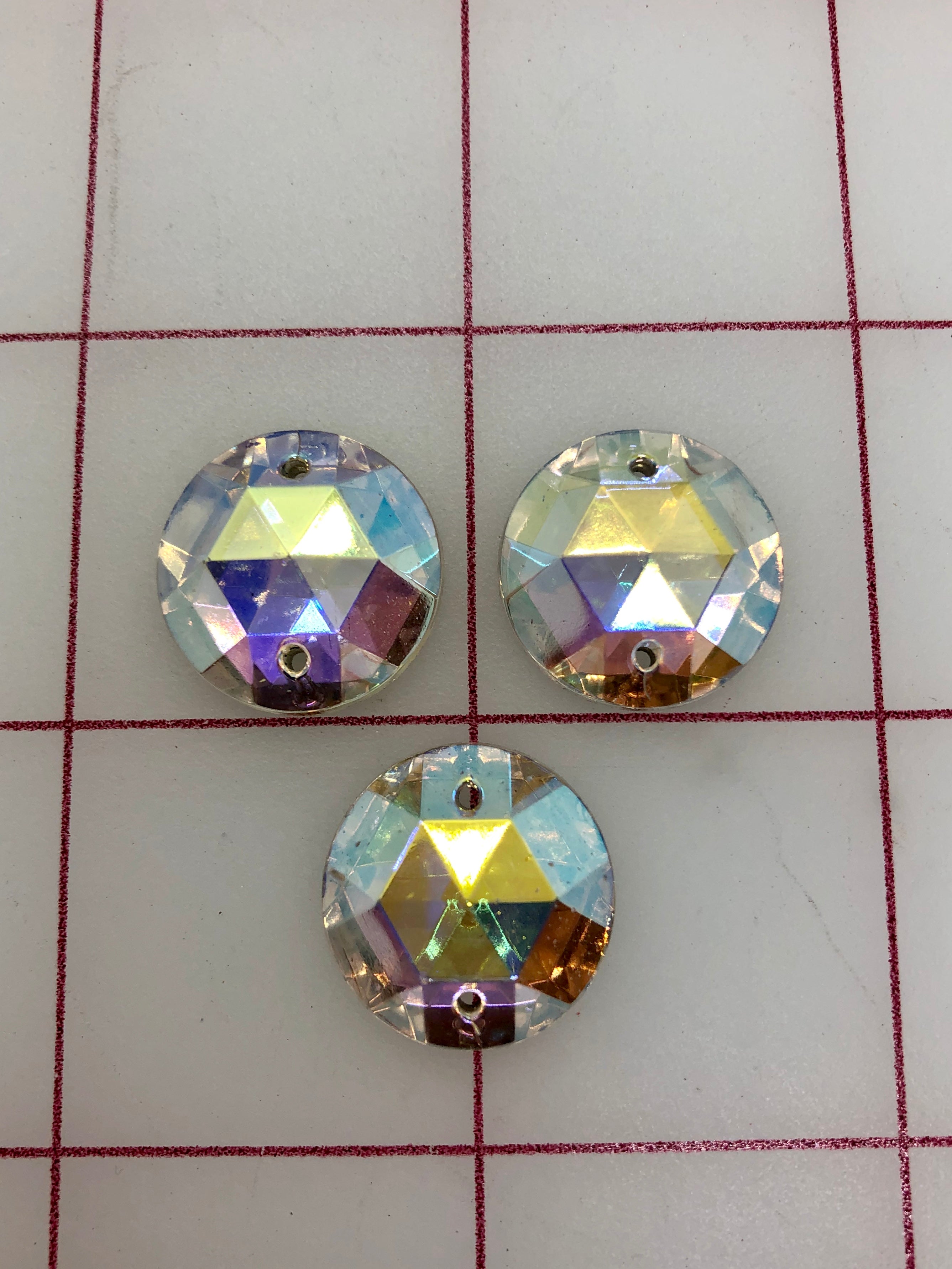 Priced per 3-pack. Lightweight, 18mm Round, Flat-Back, Sew-On Czech Rhinestones. AB means "Aurora Borealis." AB stones have a rainbow coating on them, allowing them to reflect subtle colors. Perfect for use on tutu plates, bodices, headpieces, tiaras, and many other costumes.