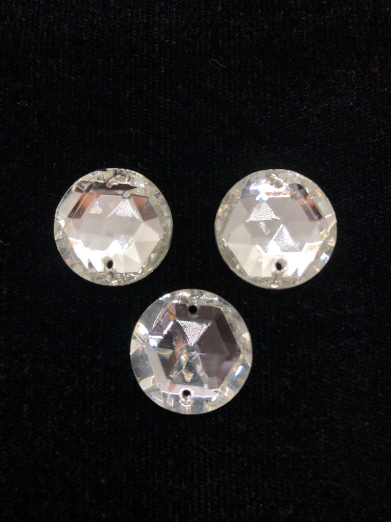 Priced per 3-pack.  Lightweight, 18mm Round, Flat-Back, Sew-On Czech Rhinestones. Perfect for use on tutu plates, bodices, headpieces, tiaras, and many other costumes.