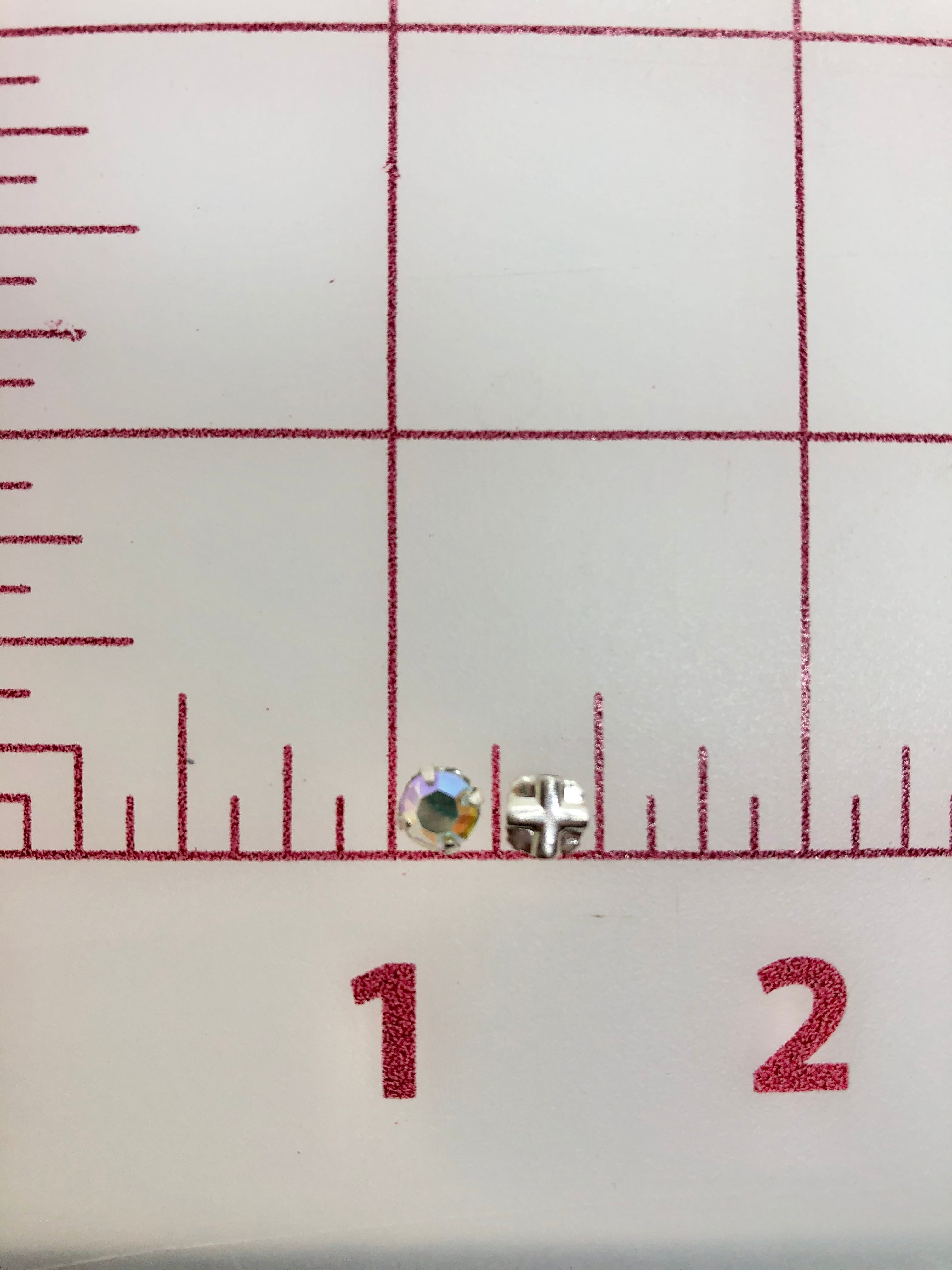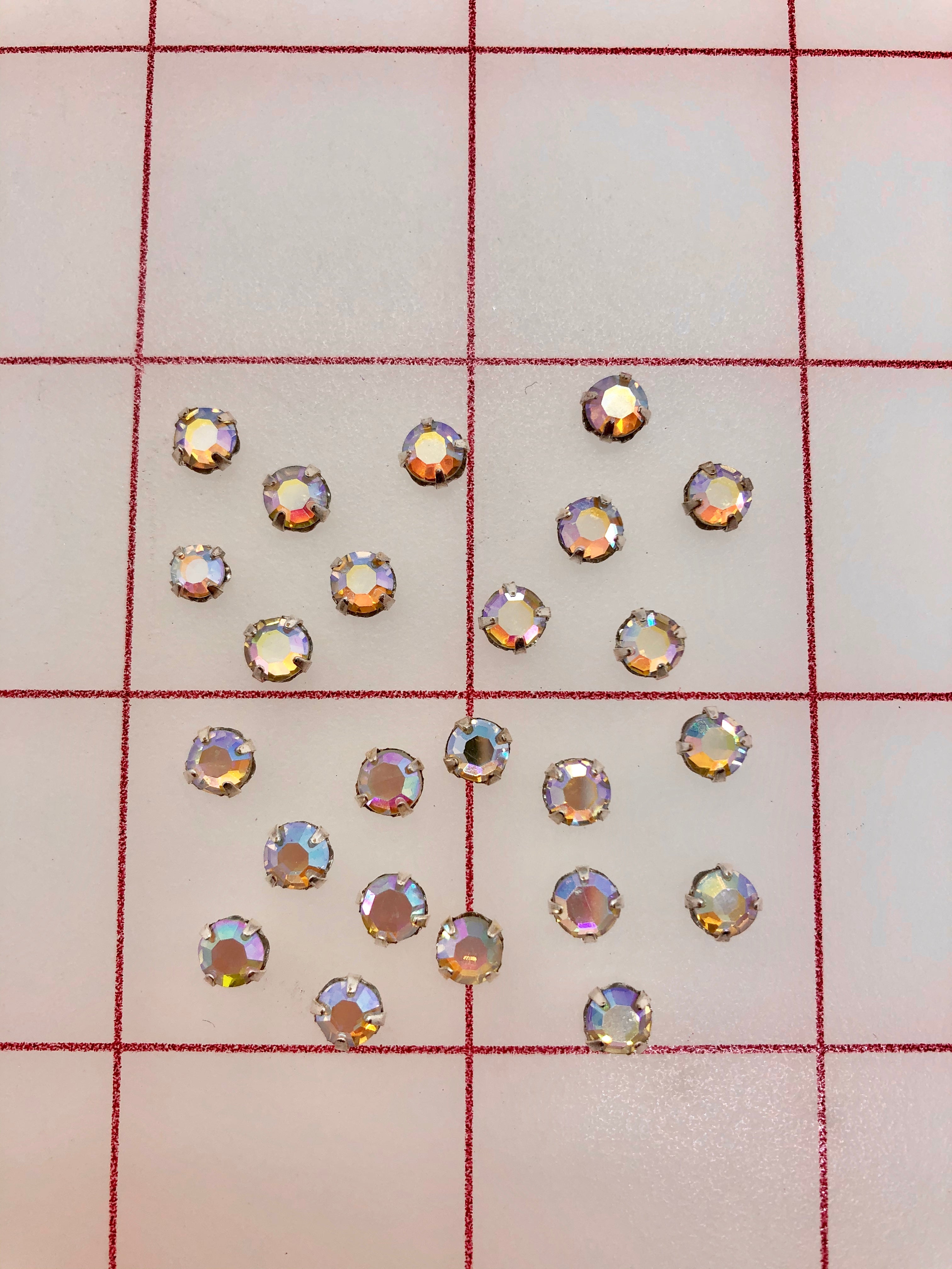 Priced per 24-pack. 20ss Czech Rose Montees. AB means "Aurora Borealis." AB stones have a rainbow coating on them, allowing them to reflect subtle colors. Perfect for tiaras and other headpieces.