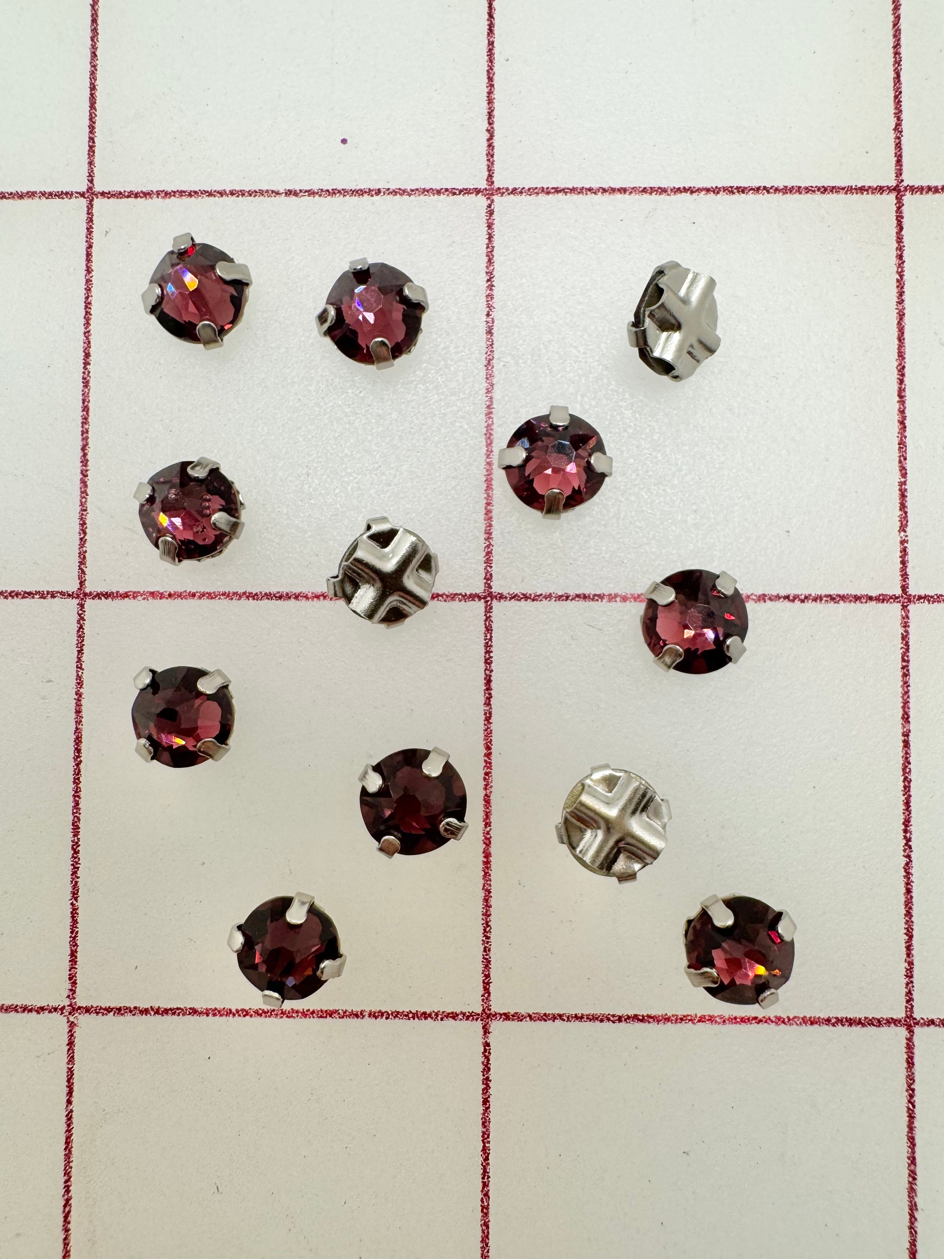 Priced per 12-pack. 30ss Rose Montees. Amethyst. Perfect for tiaras and other headpieces. 10% discount on half gross pack. 20% discount per one gross pack.