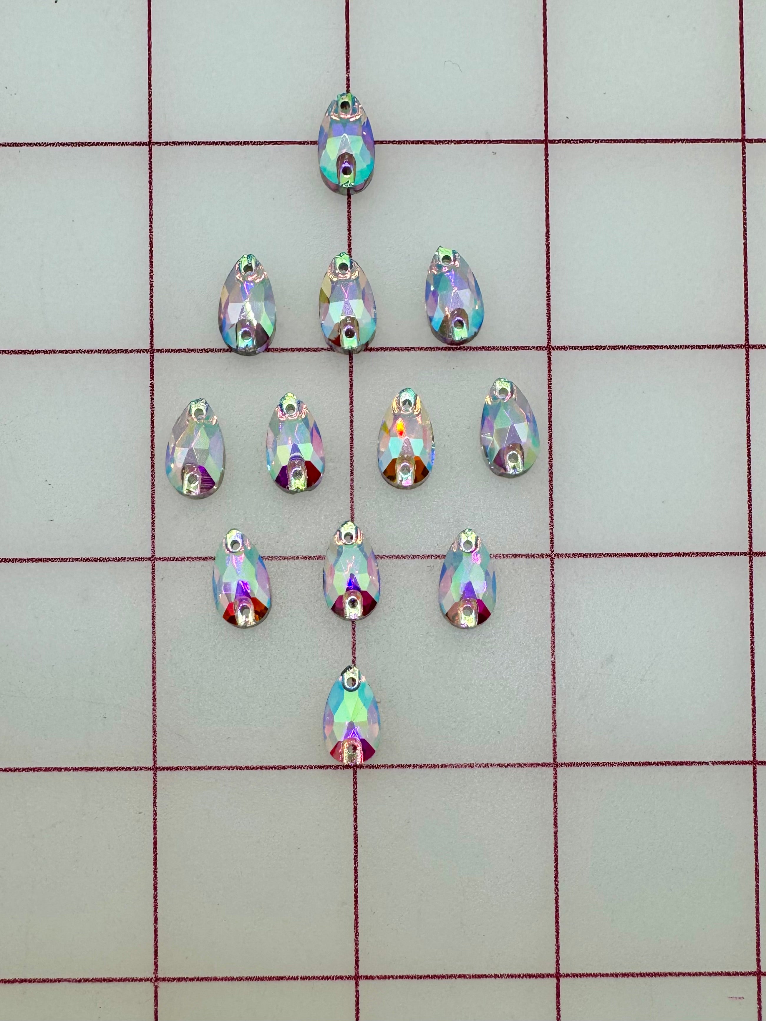 Priced per 12-pack. 7x12mm flat back Pears, or "teardrop"-shaped sew-on rhinestones. Lightweight and delicate!