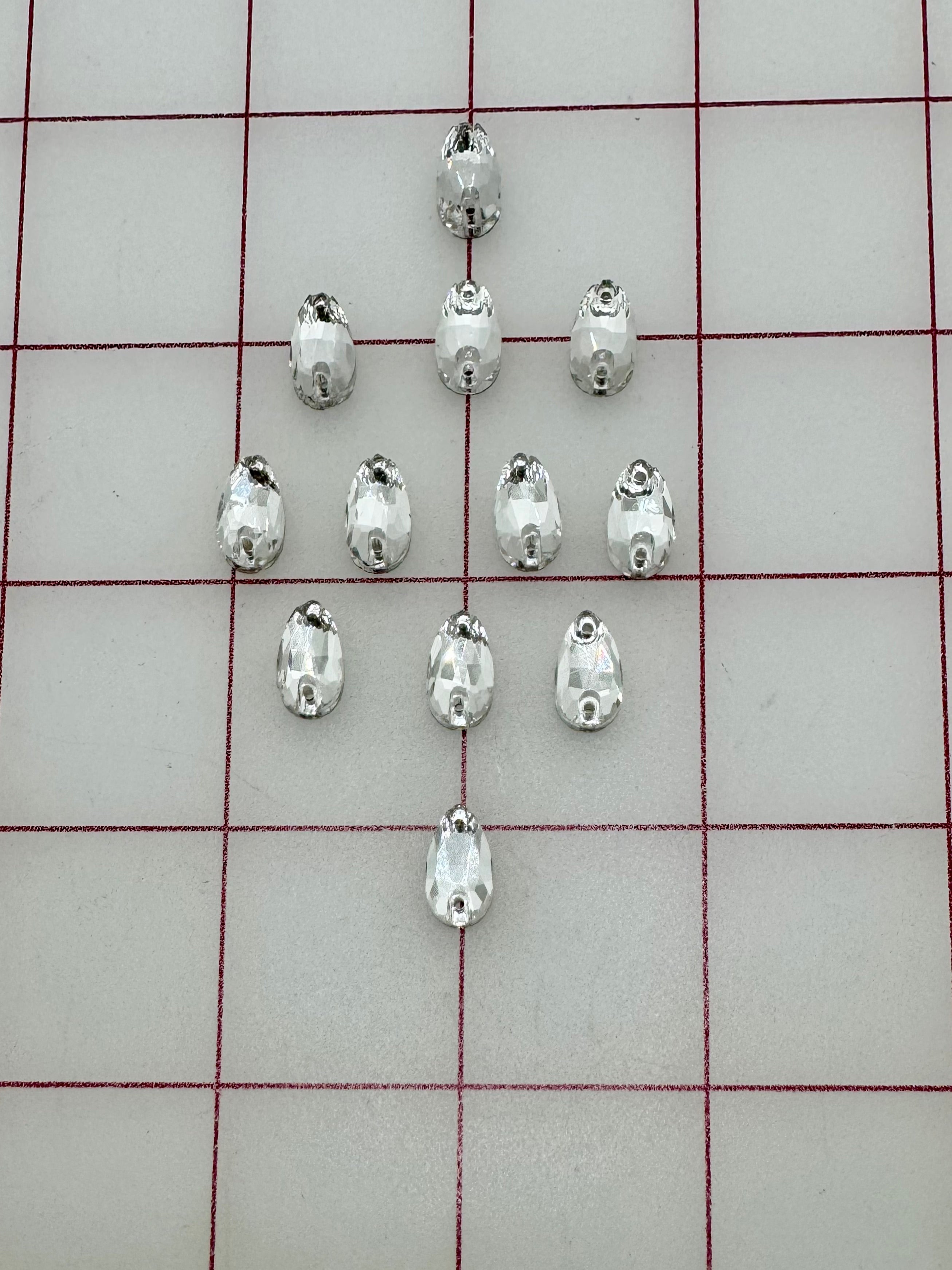 Priced per 12-pack.  7x12mm flat back Pears, or "teardrop"-shaped sew-on rhinestones. Lightweight and delicate!