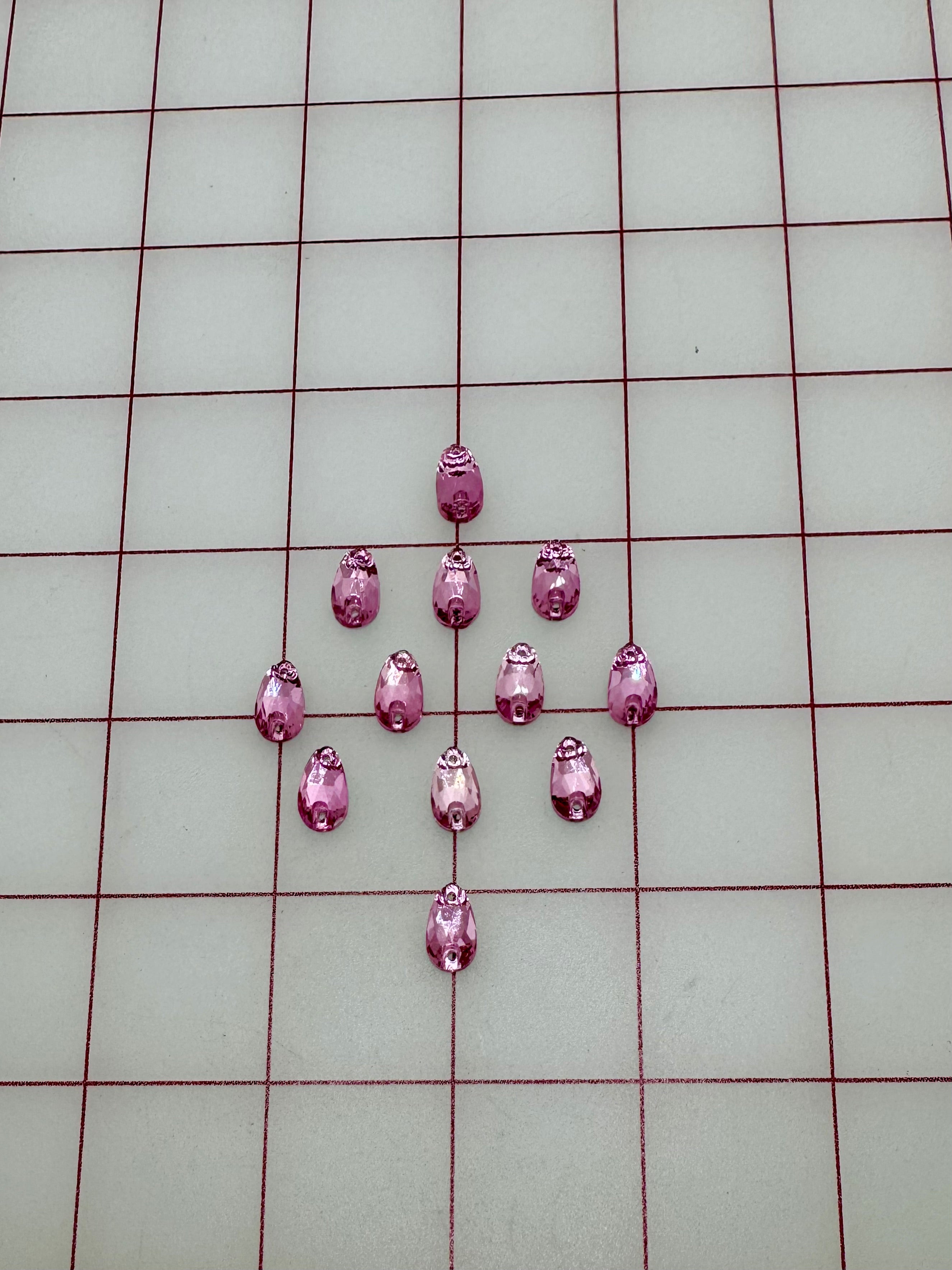 Priced per 12-pack. 7x12mm flat back Pears, or "teardrop"-shaped sew-on rhinestones. Lightweight and delicate!