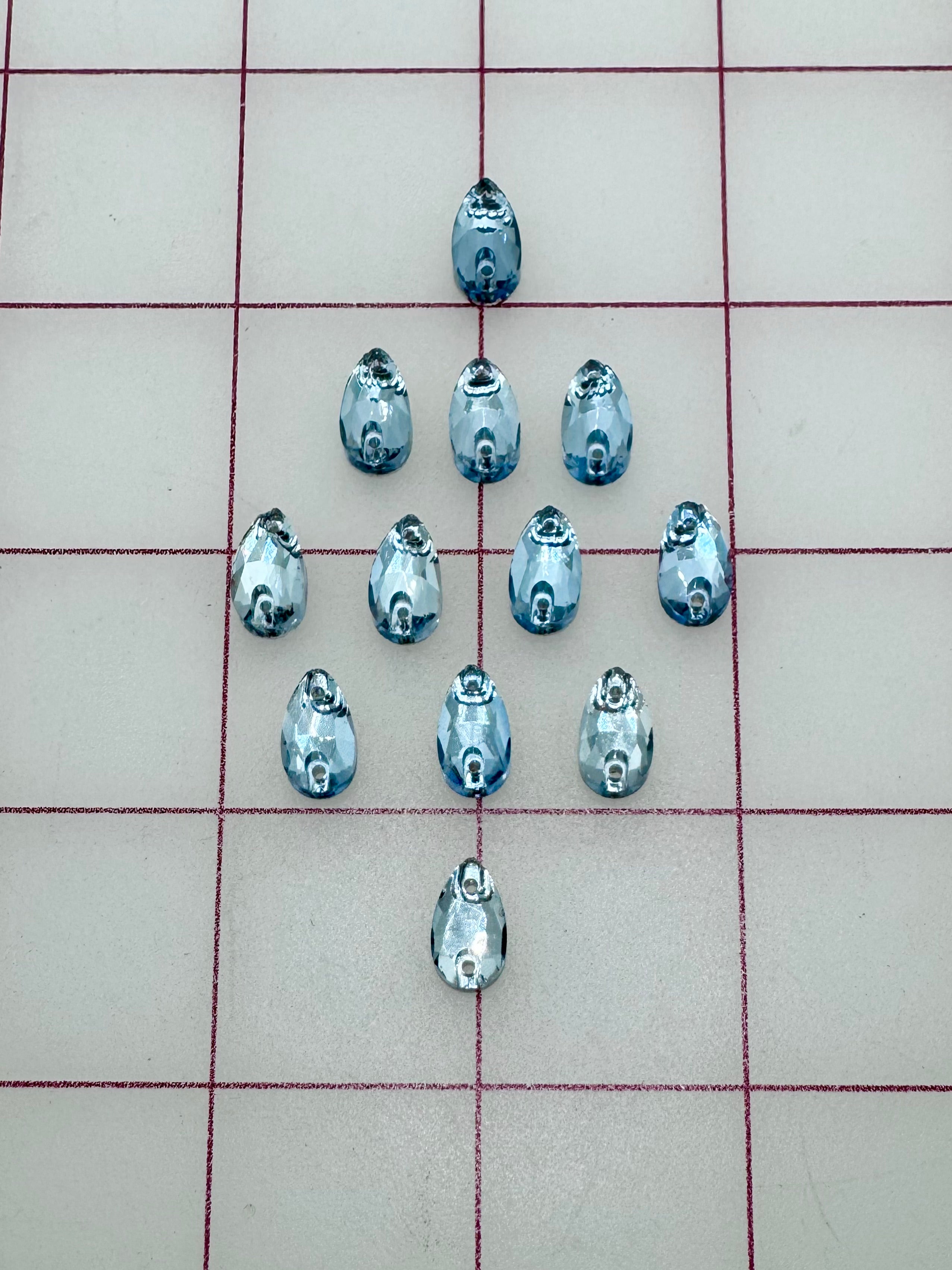 Priced per 12-pack. 7x12mm flat back Pears, or "teardrop"-shaped sew-on rhinestones. Lightweight and delicate!