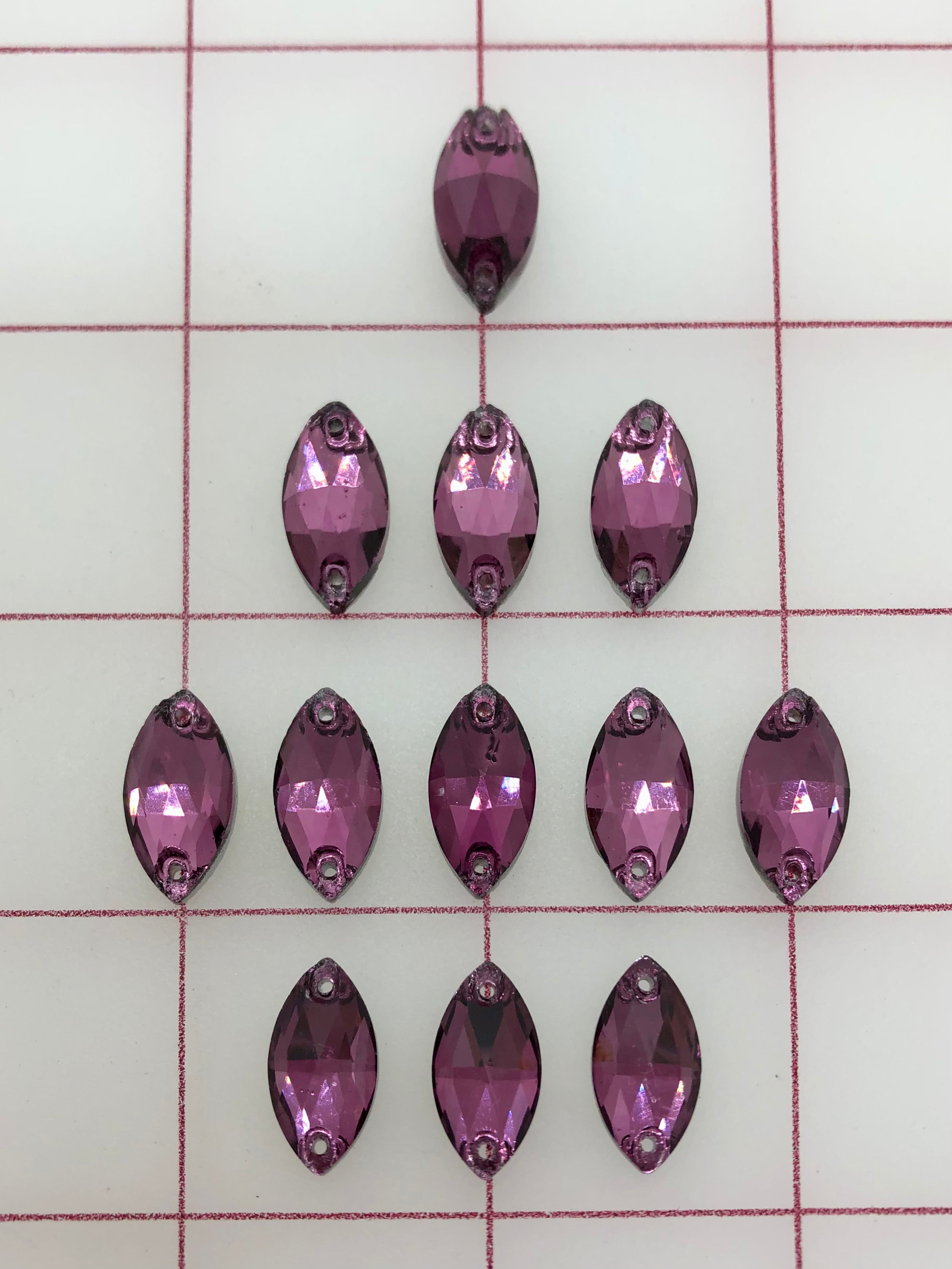 Priced per 6-pack. 9x18mm flat back Navette, or "cat's-eye"-shaped sew-on rhinestones. 20% discount per 12-pack (one dozen). 30% discount per 1/2 Gross (six dozen).