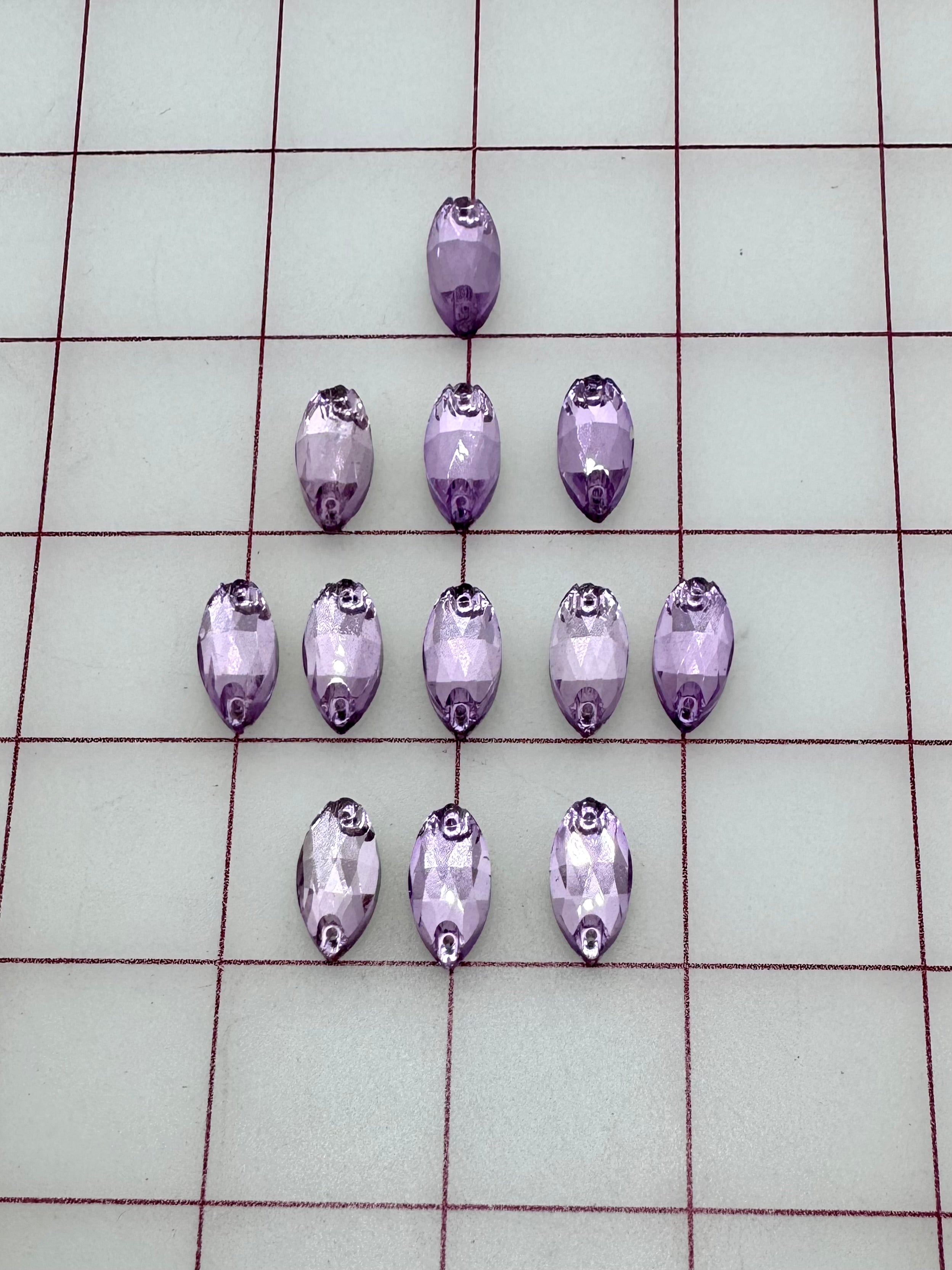 Priced per 6-pack. 9x18mm flat back Navette, or "cat's-eye"-shaped sew-on rhinestones. 20% discount per 12-pack (one dozen). 30% discount per 1/2 Gross (six dozen).