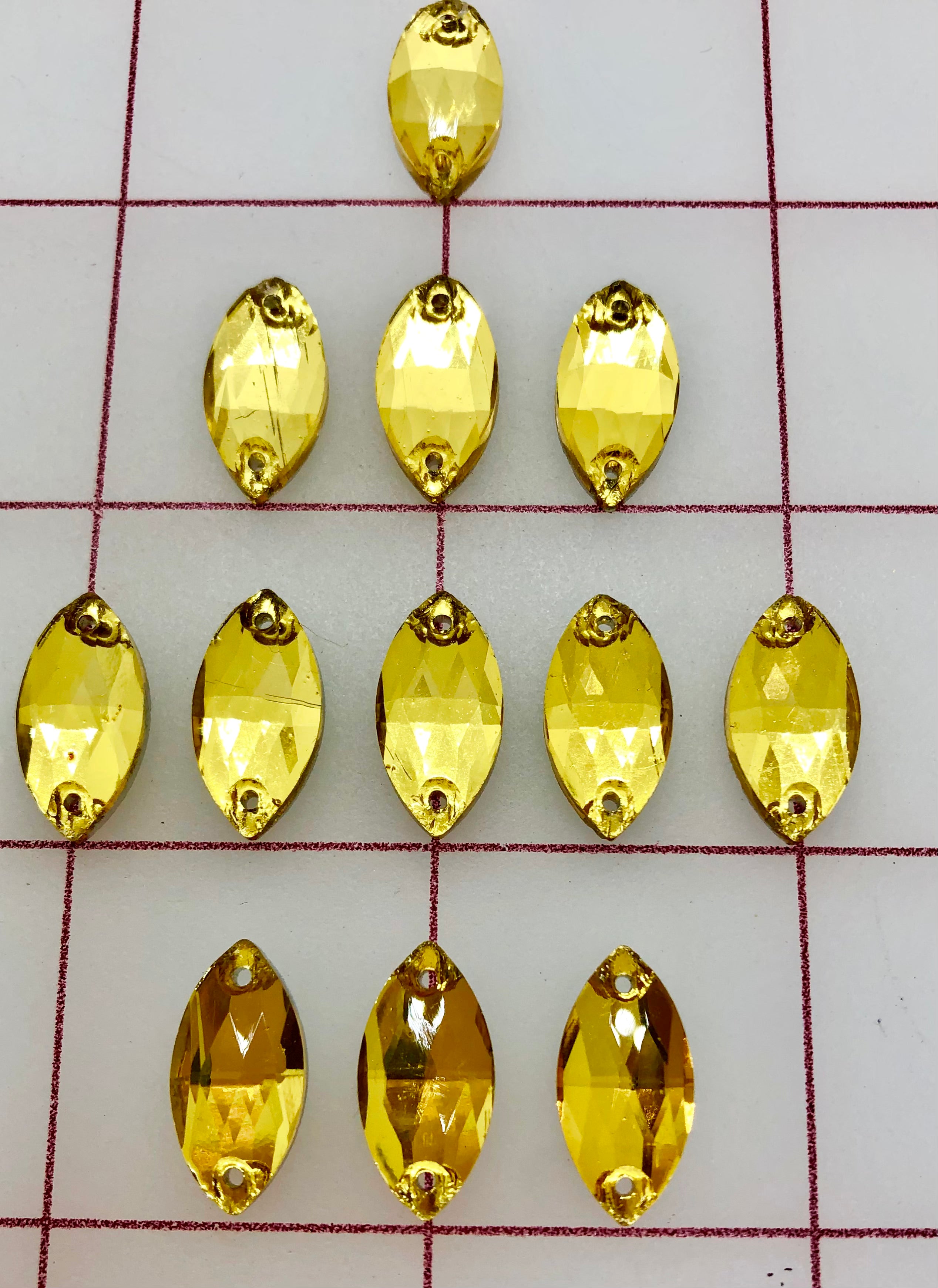 Priced per 6-pack.  9x18mm flat back Navette, or "cat's-eye"-shaped sew-on rhinestones. 20% discount per 12-pack (one dozen).  30% discount per 1/2 Gross (six dozen).