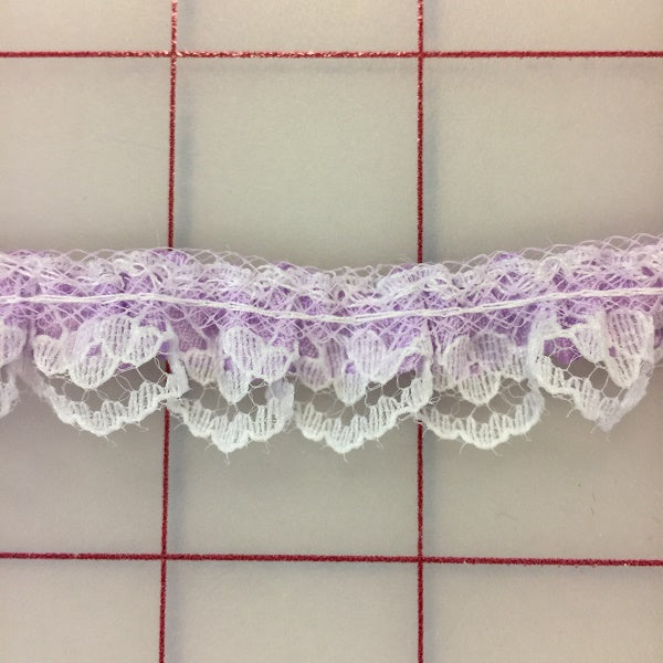 Priced per yard. lavender ruffled lace and satin. 1/2-inch wide.