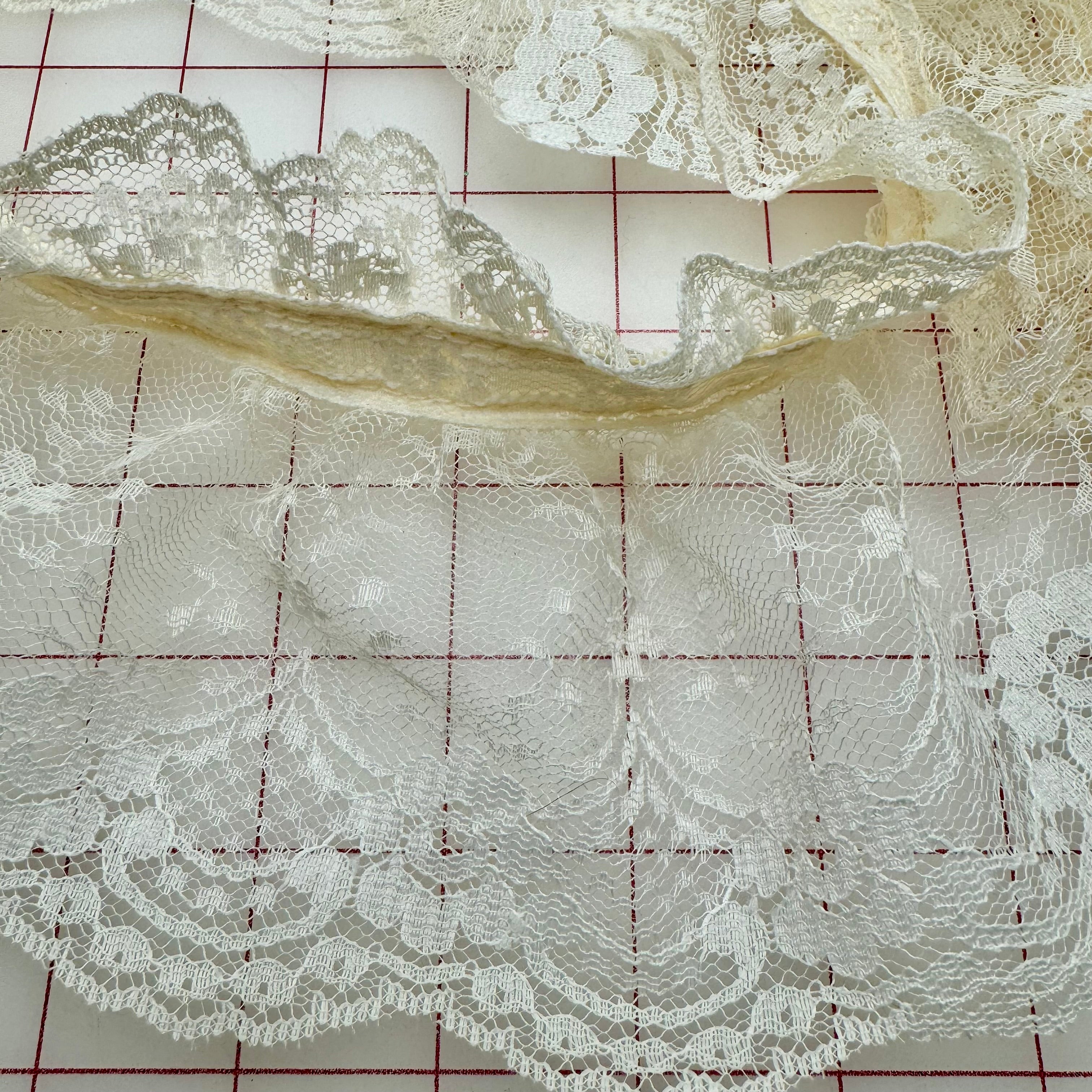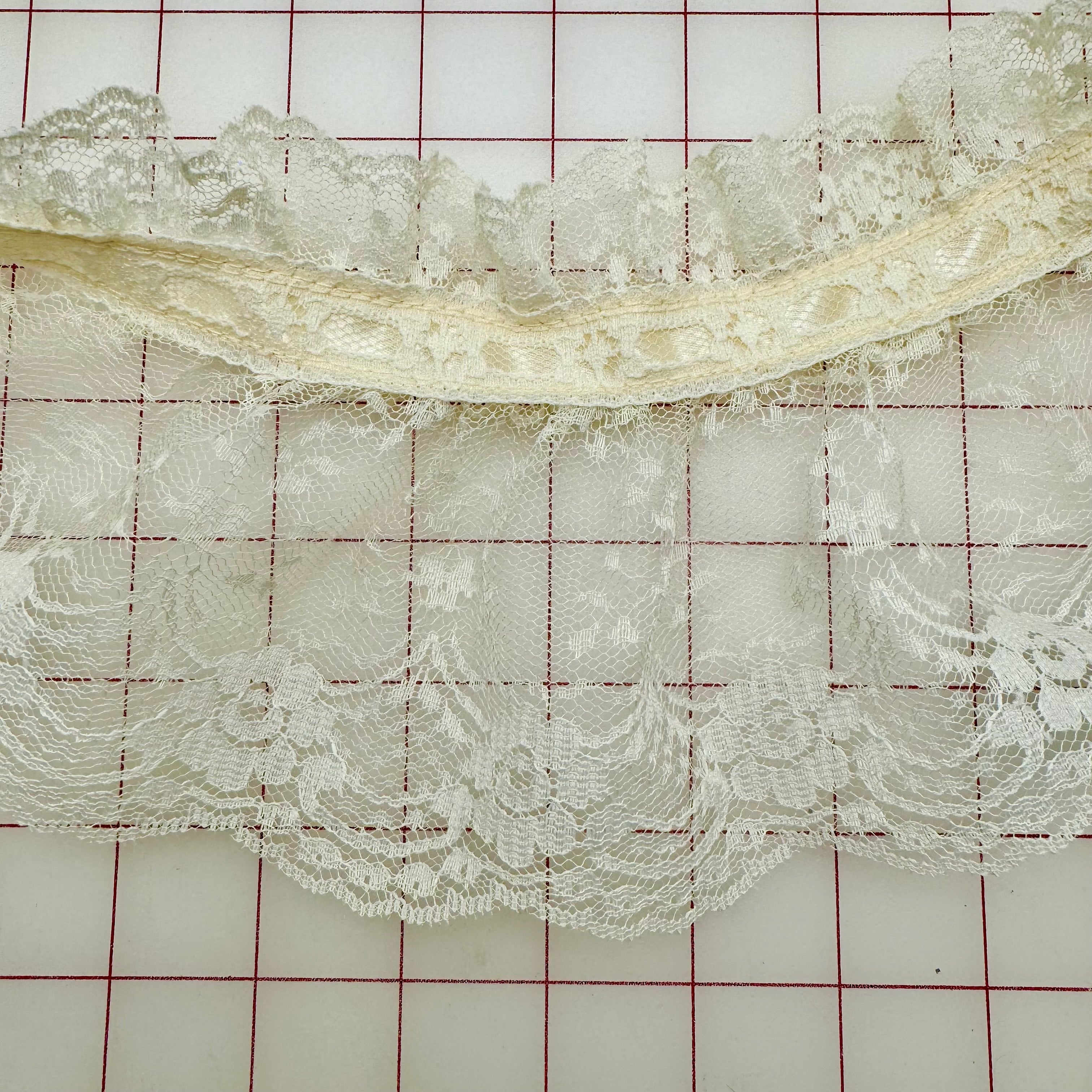 Priced per yard. Fancy ivory ruffled lace with a half-inch single face satin ribbon. 5-inches wide. Beautiful lace!