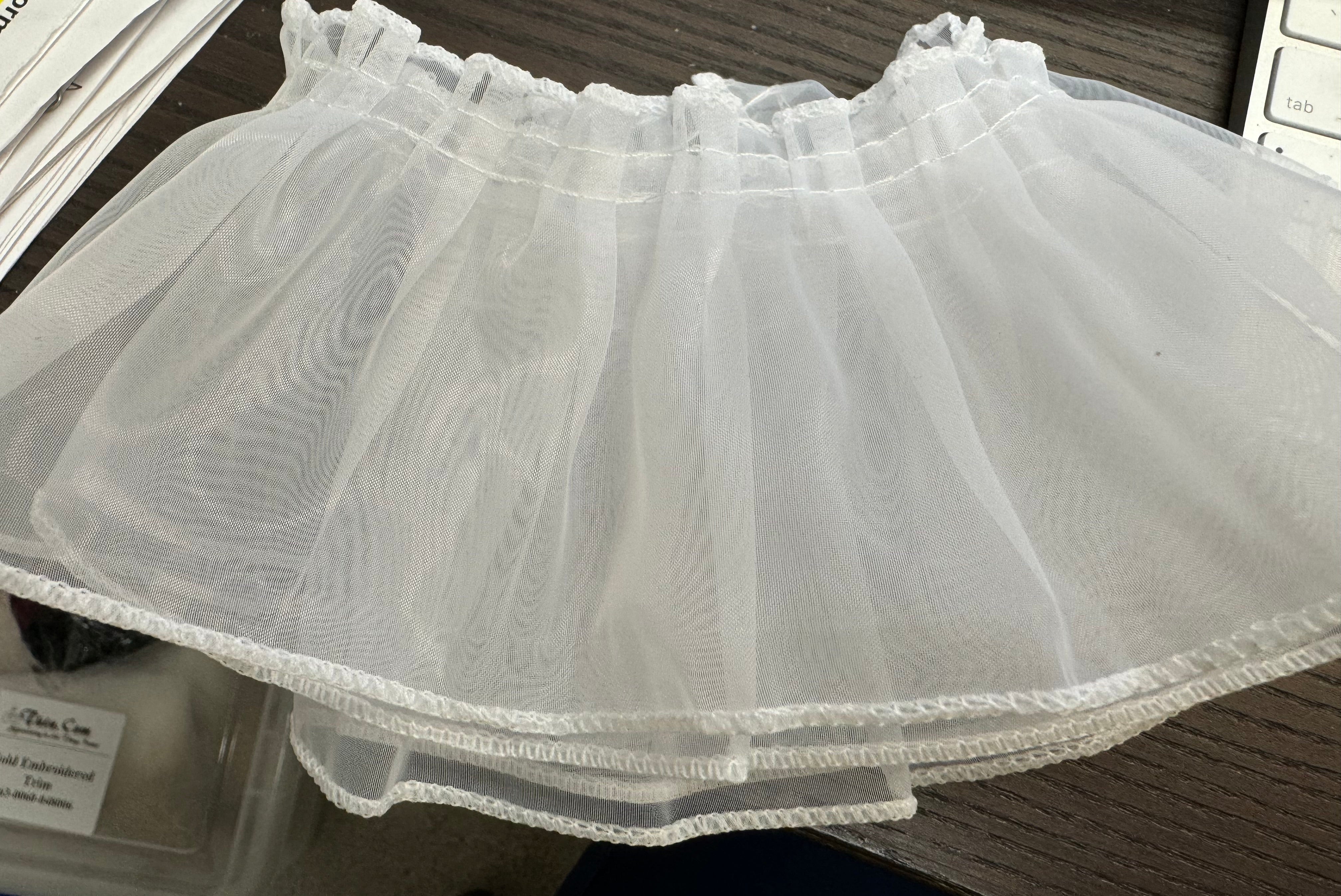 Priced per yard. White ruffled organza with a rolled-hem edging. 3-inches wide. Perfect for many costumes, bridal, and formalwear. Lightweight ad delicate.